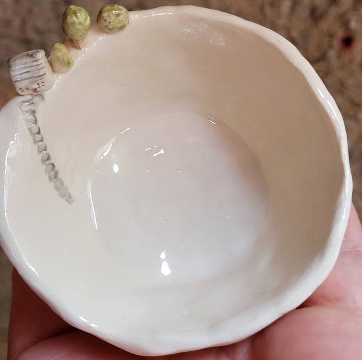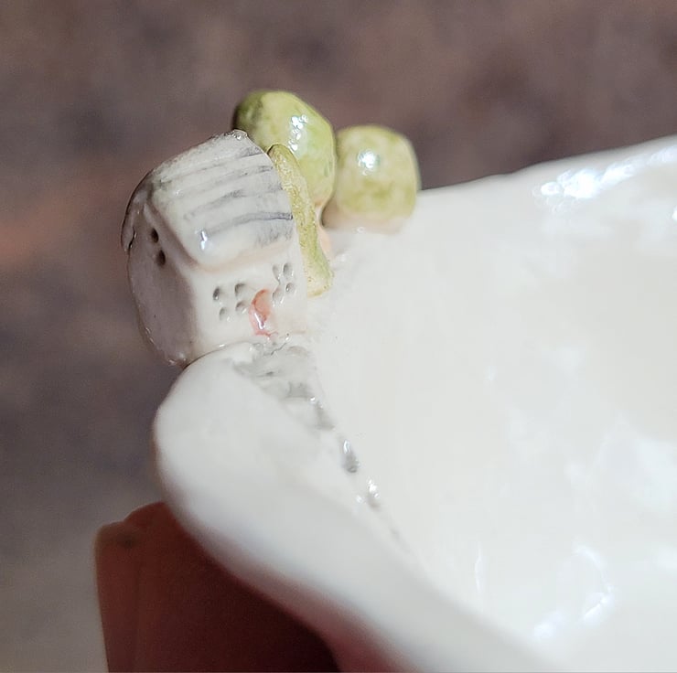 This little pot has a tiny house and trees to sit on the edge and miniature steps pushed into the clay at the side of the pot . Perfect little candle companion.