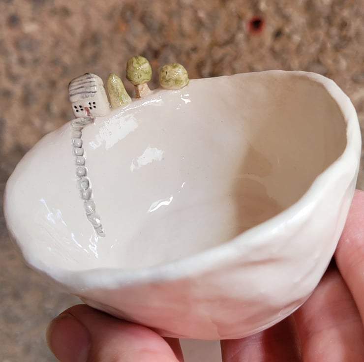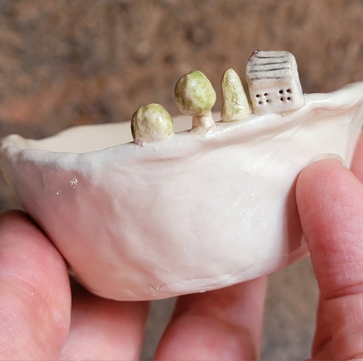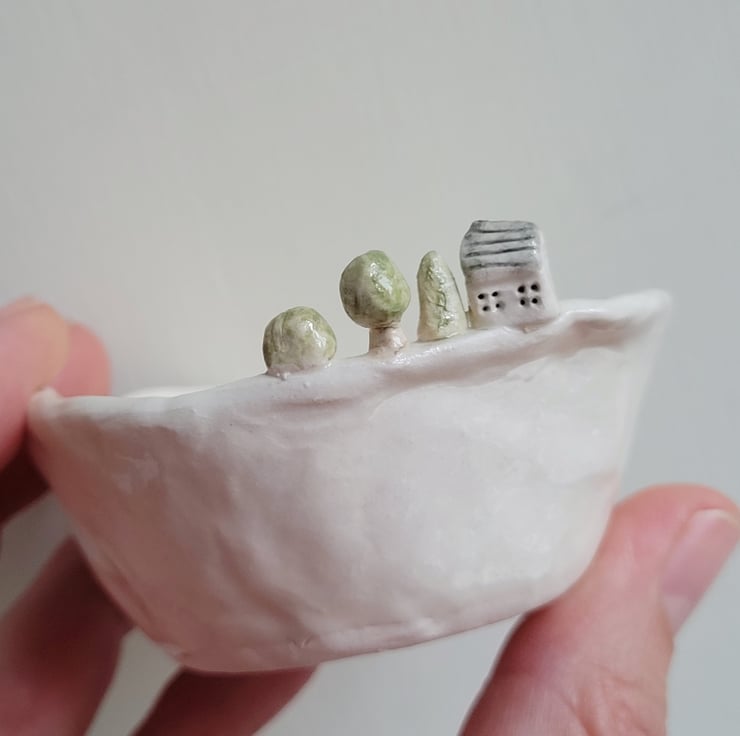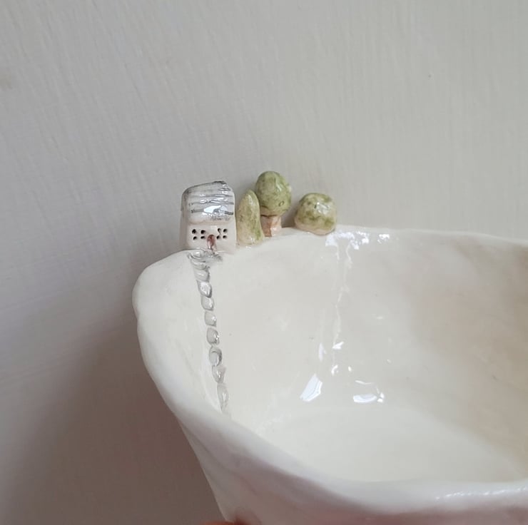 For new home or Christmas gift . There is a tiny hand modelled and painted house and trees on the side with little steps in white clay and clear shiny glaze .
