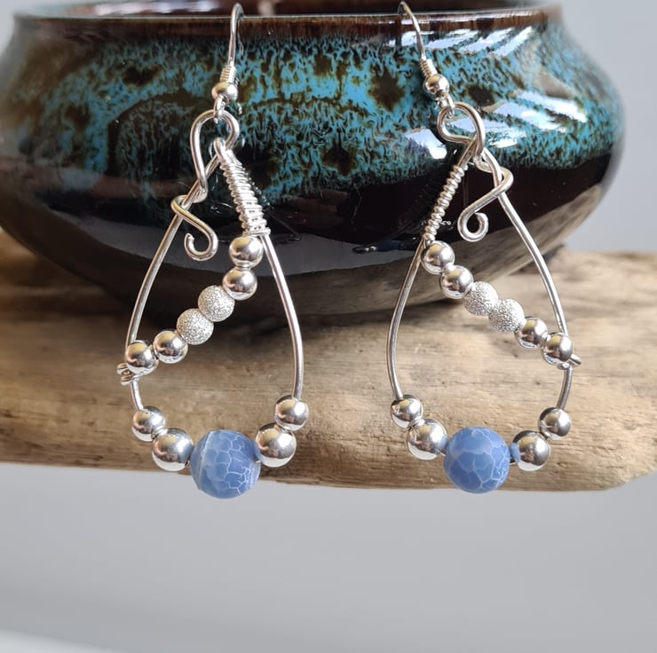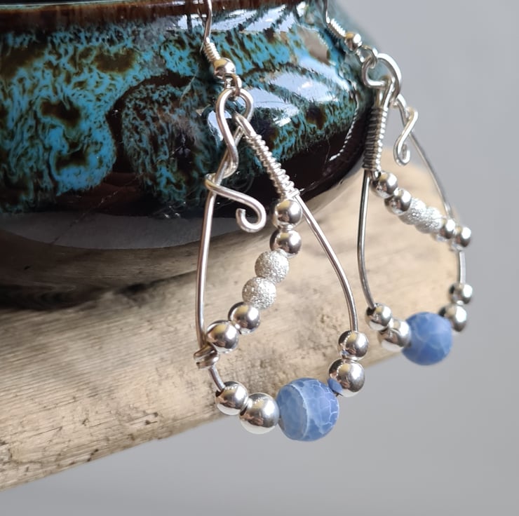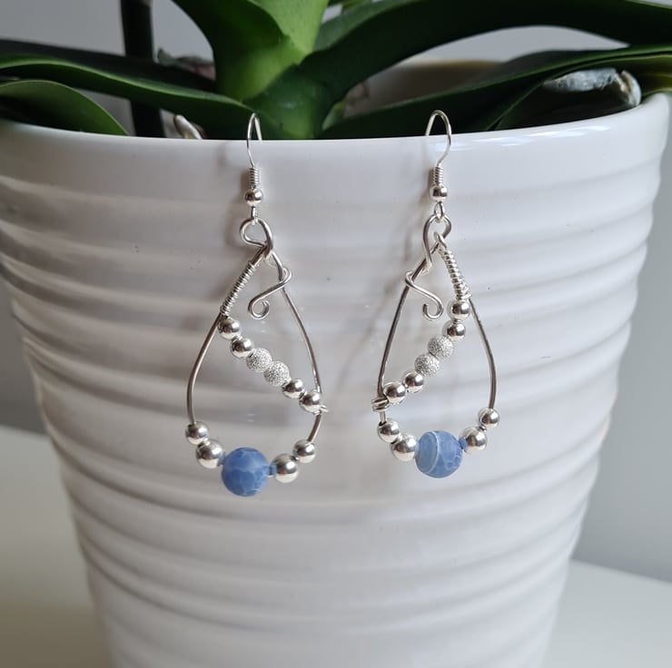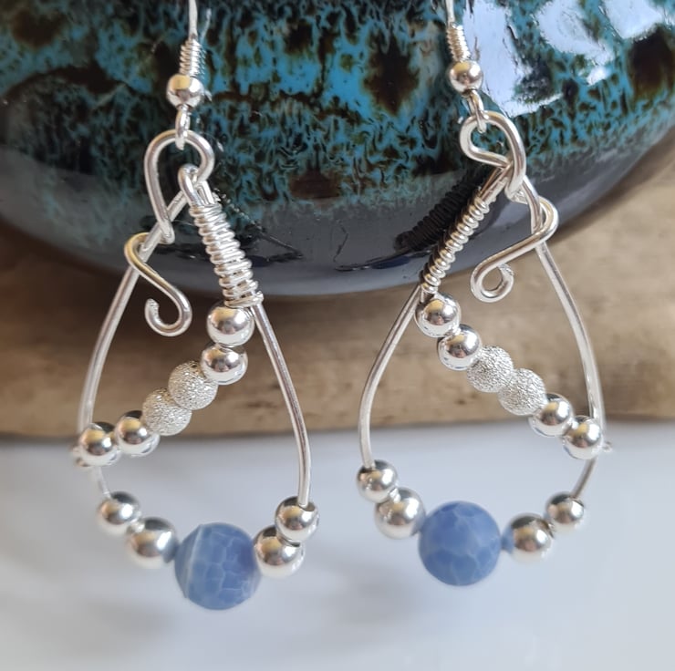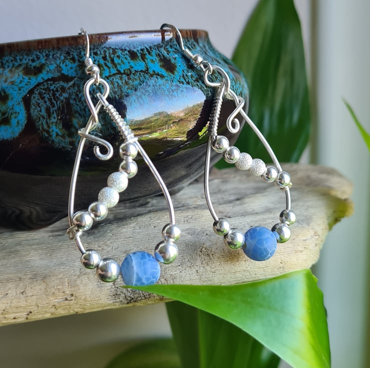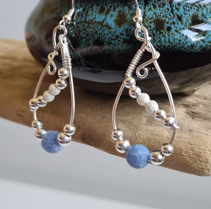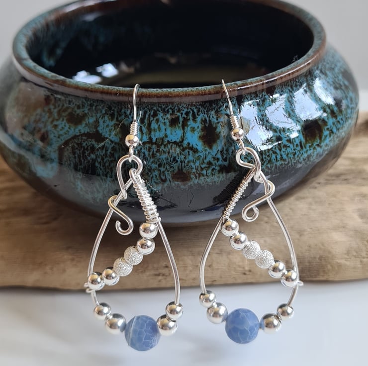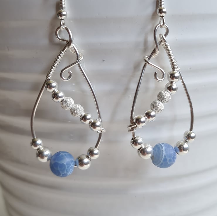 I have handcrafted these unique earrings using 925 Silver wire, and beautifully elegant Blue Crackled Natural Agate Beads and Sterling Silver beads, hung on 925 Silver Ear bars.
