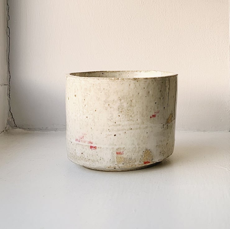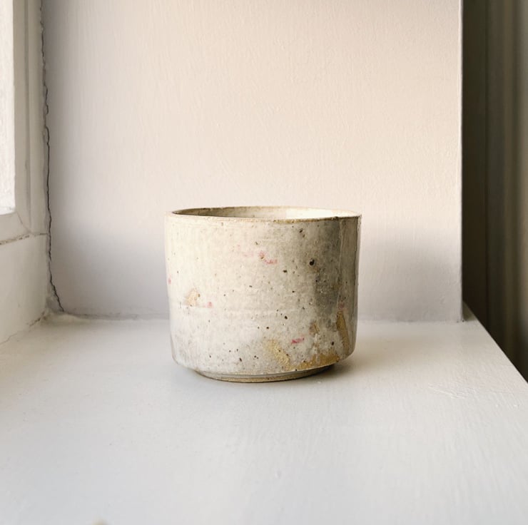 Wheel thrown handle-less mug in chamotted flecked stoneware. finished in a cloudy white/iridescent glaze with hand-painted red bricks underneath. 8.5cm in diameter (mouth), perfect as a gift to friends or loved ones, for teas or coffees. holds 200ml. one of a kind!