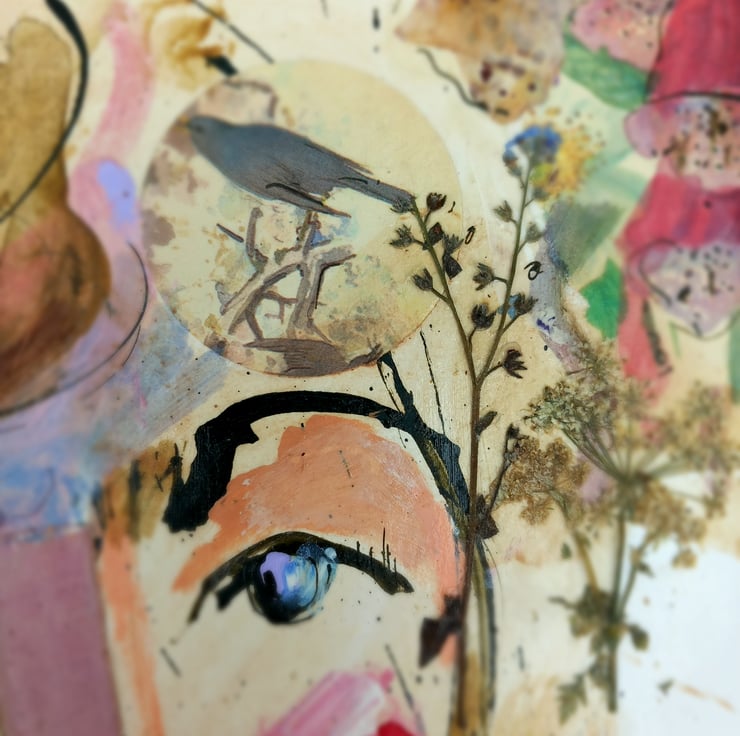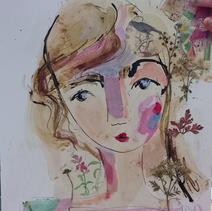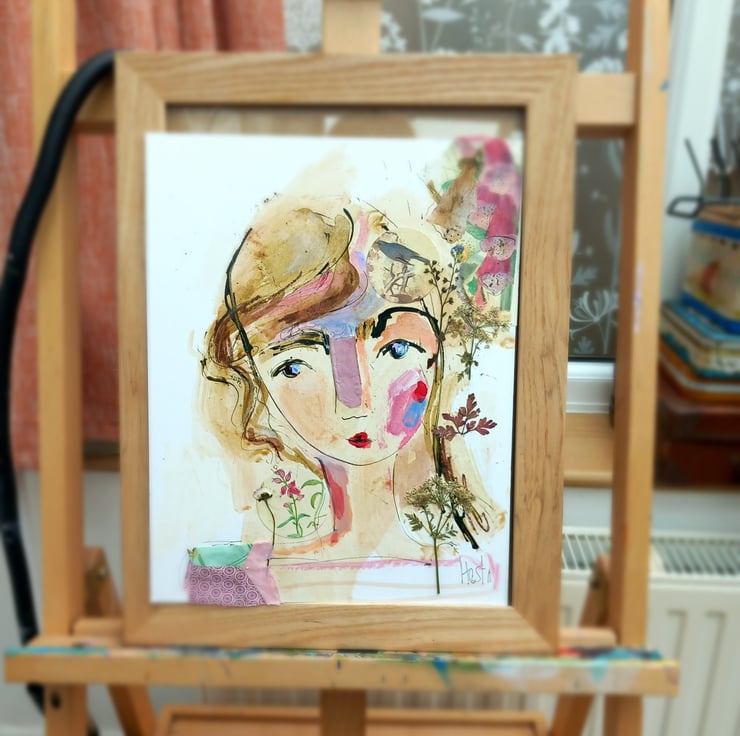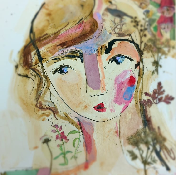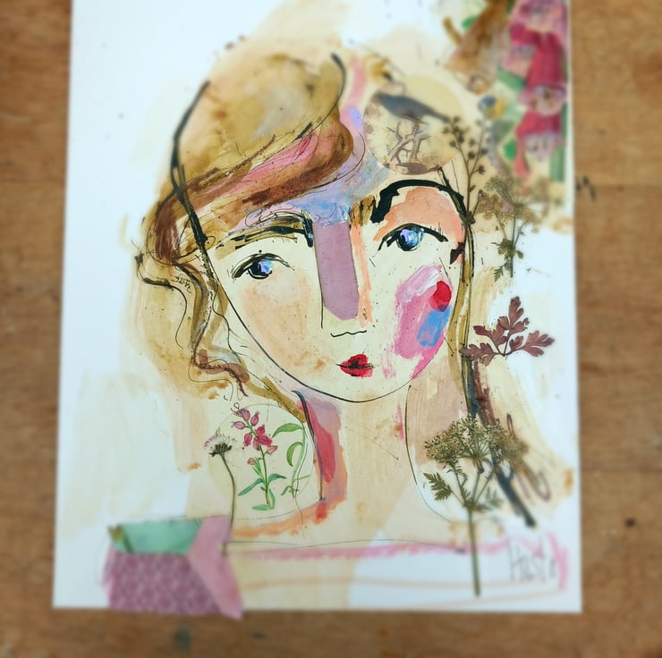 This one off drawing /painting unframed on high quality card . Made using reels dipped in Indian ink then pressed flowers and vintage fabrics and paper are added. Its loose, free and full of joy, orange and blue play against each other. I post flat between card. Each inky girl is unique, these are originals not prints. They have had a light seal of matt varnish. Hours of work building up the delicate image. 36 cm tall unframed. No two can ever be the same x come mindfully packaged flat between card. More on my Instagram Bodkincreates. Smaller than my normal ones 30 cm tall.
