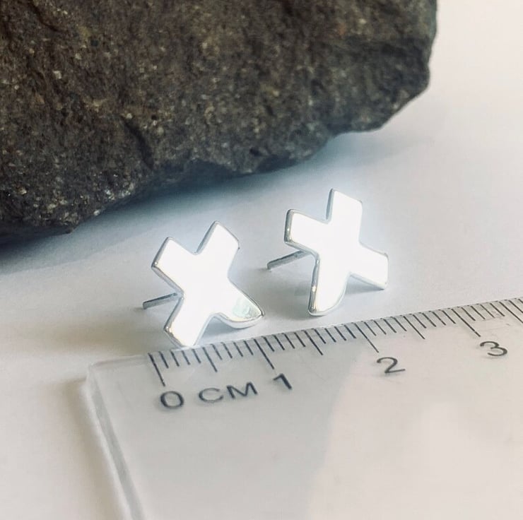 Saltire design pierced out from Sterling Silver sheet and polished 14 mm X 14 mm stud earrings Ear scrolls supplied