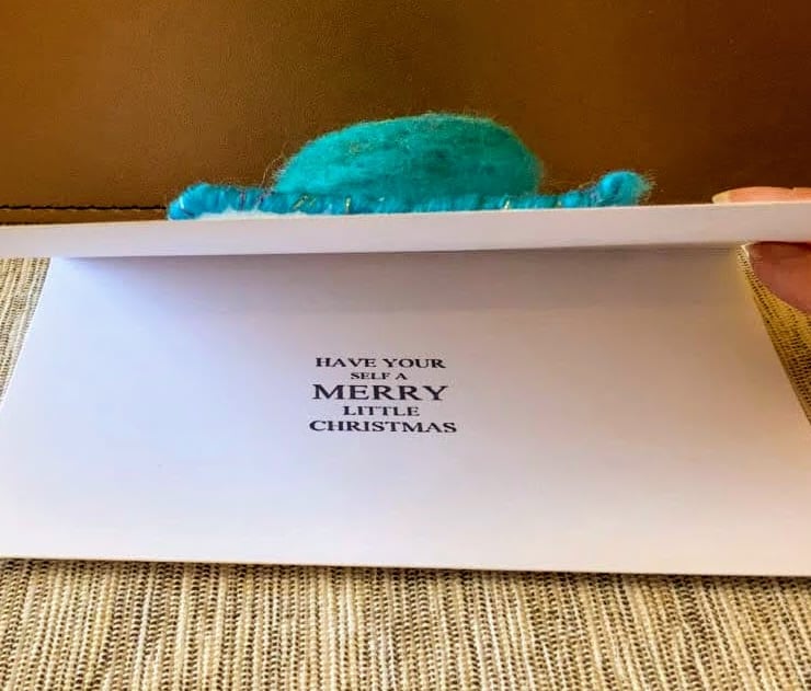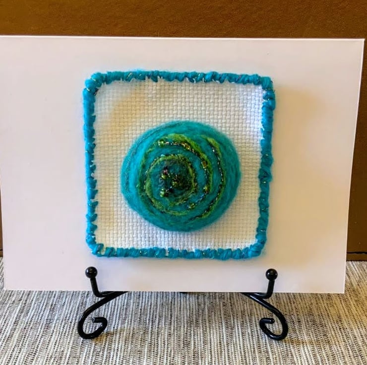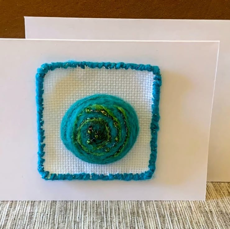 A card and gift all in one. Hand made wool brooch in teal blue is pinned to the cotton frame.