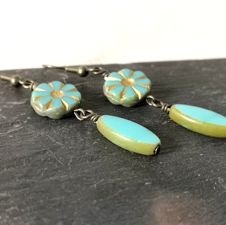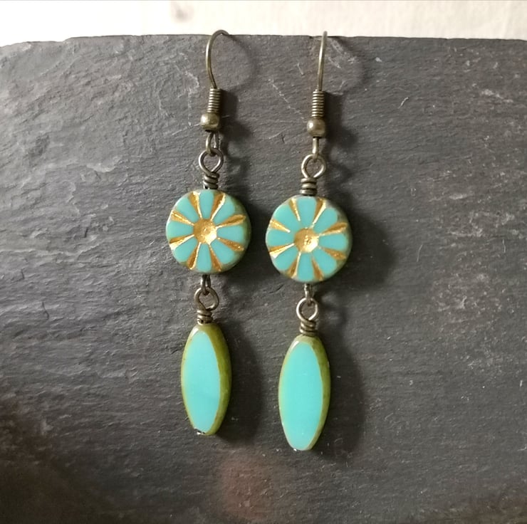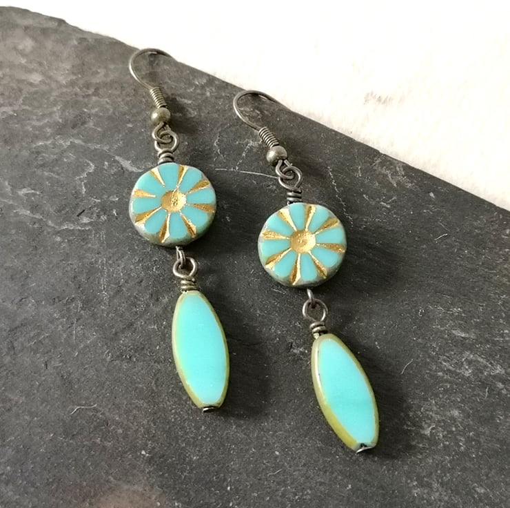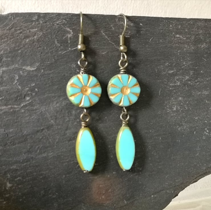 These earrings feature beautiful Czech glass beads in a lovely turquoise. The top pair are especially pretty, with a flower or sunburst decoration picked out in gold. They've been attached to antique gold coloured ear wires.