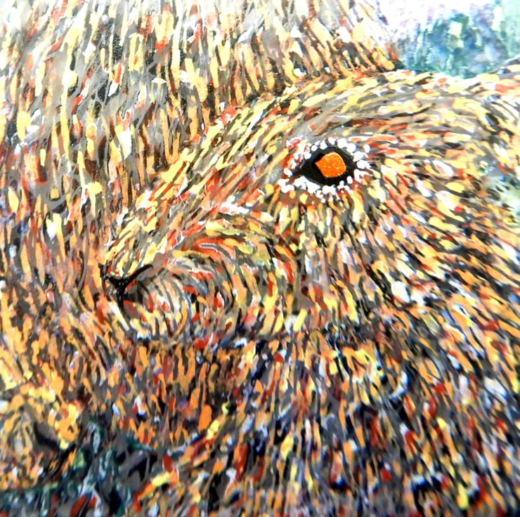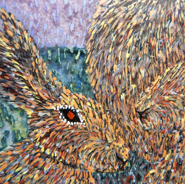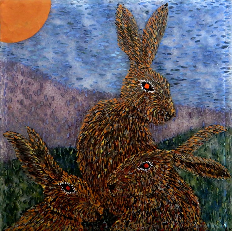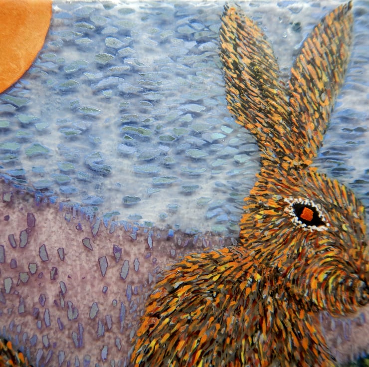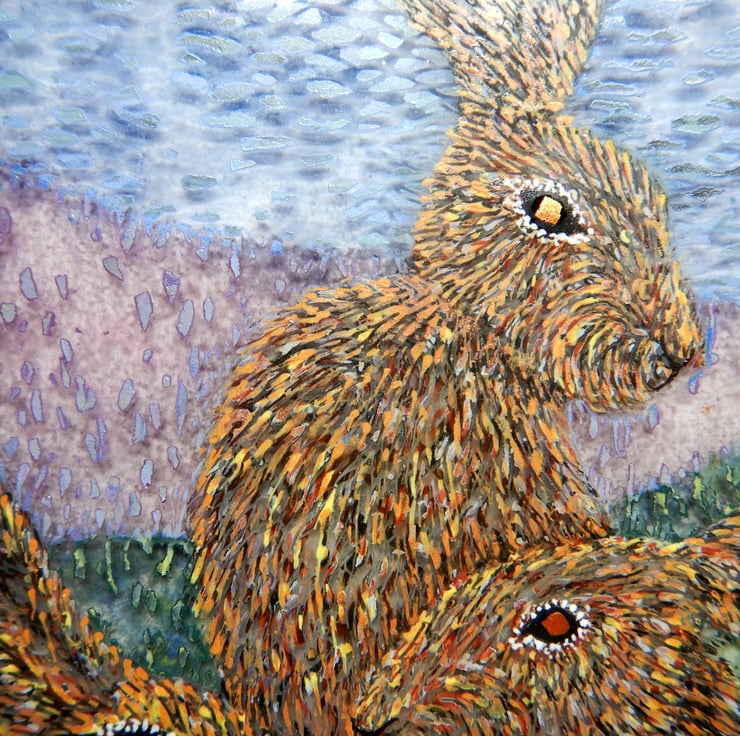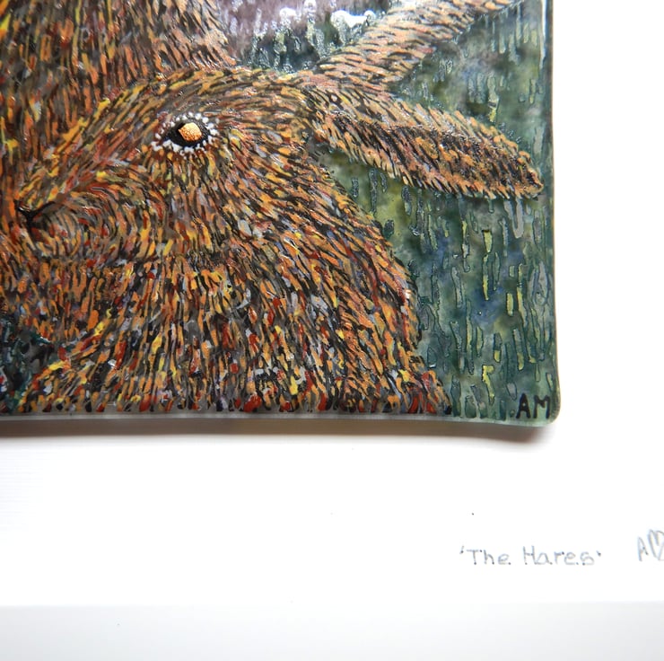 This picture started off as a sheet of transparent fusing glass. The hares' were then painted on using glassline powders. The colours were layered and then scraped through to bring out the individual colours and the texture of the hares' hair.