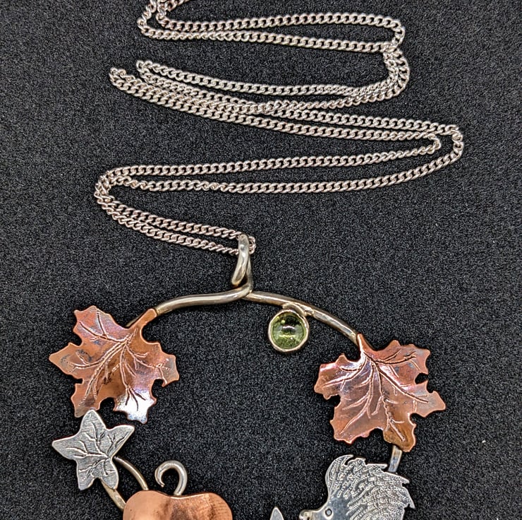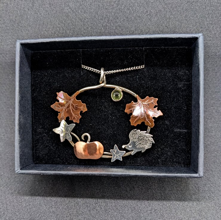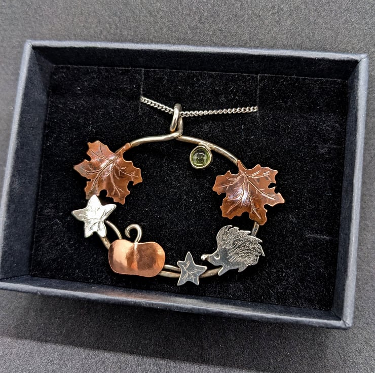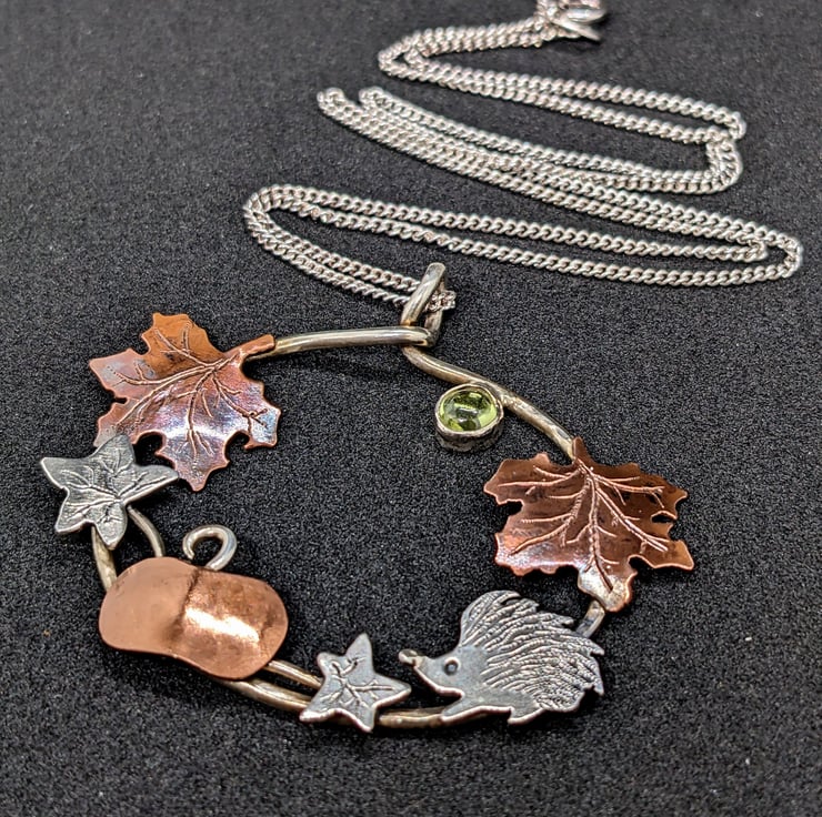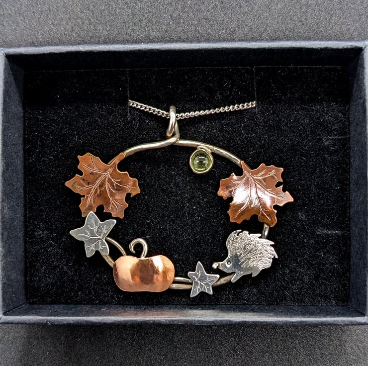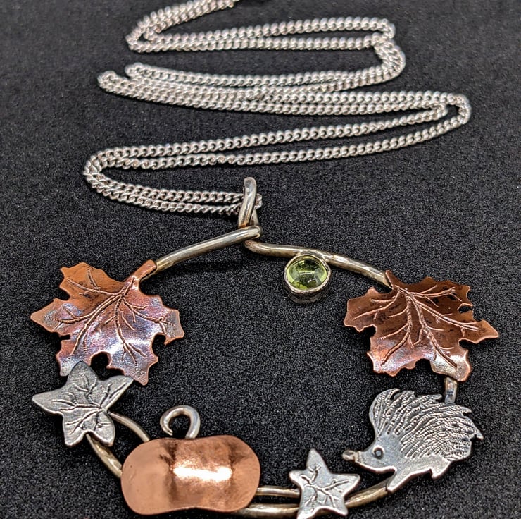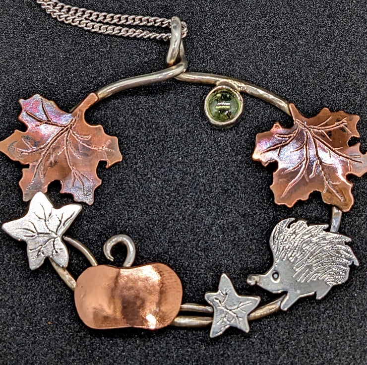 This autumn inspired, sterling silver and copper pendant is completely handmade to my original design. The pendant is made from silver wire and decorated with hand drawn and hand saw pierced silver and copper leaves, a tiny silver hedgehog and a copper pumpkin. The pendant includes a pretty 5mm peridot gemstone. This unique pendant would be the perfect jewellery gift for anyone who loves autumn and nature or perhaps an October or November birthday.