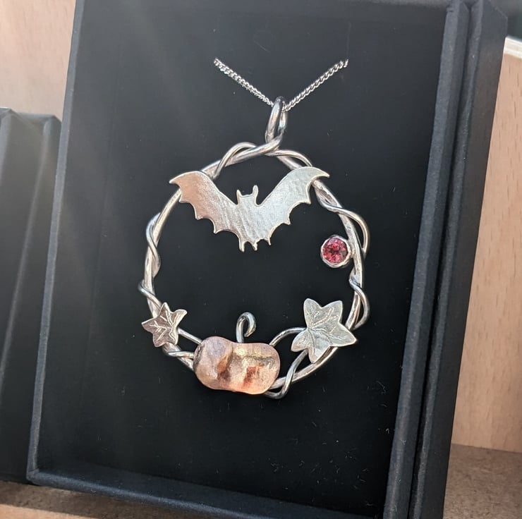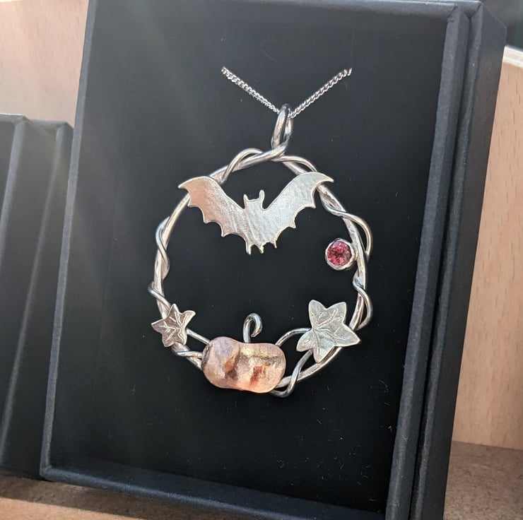 This Halloween inspired, sterling silver and copper pendant is completely handmade to my original design. The pendant is made from silver wire and decorated with a hand drawn and hand saw pierced silver bat and and a copper pumpkin with silver leaves. The pendant includes a spooky garnet gemstone.