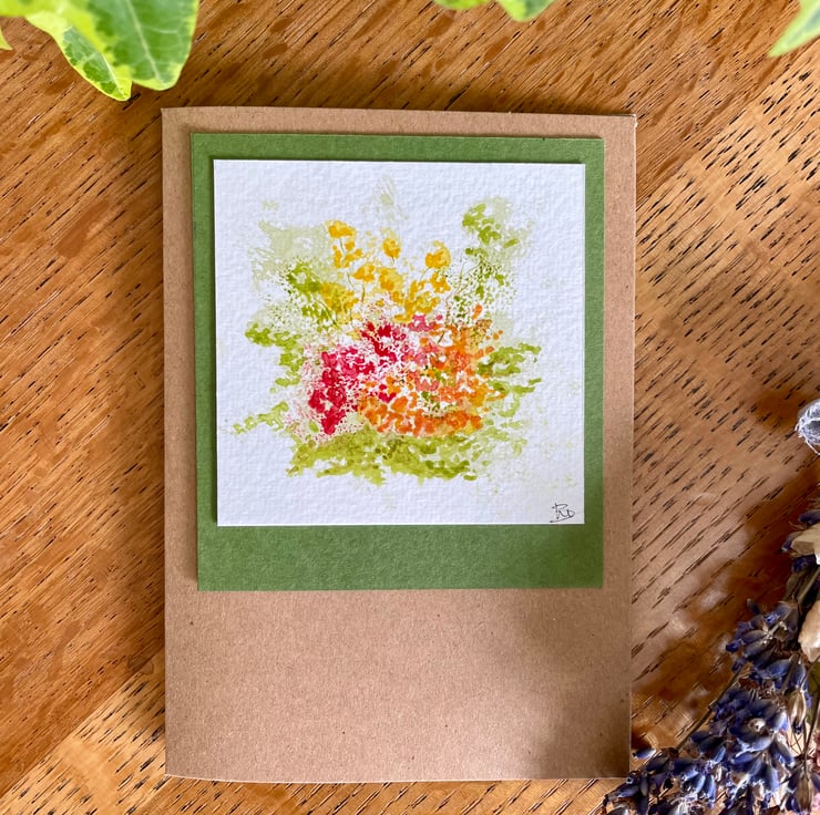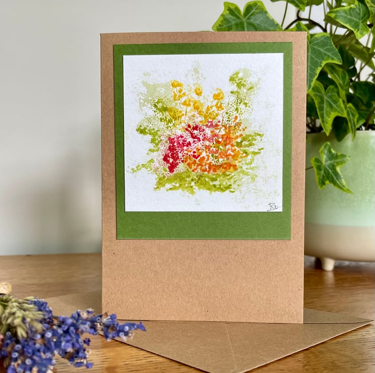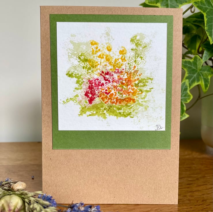 Hand painted floral watercolour card in autumn colours, the original artwork features my interpretation of a 'hot' coloured autumn herbaceous border and is mounted onto complimentary olive card prior to being mounted onto a brown recycled card and is left blank for any occasion or even framed as a tiny piece of affordable art as many of my customers do.