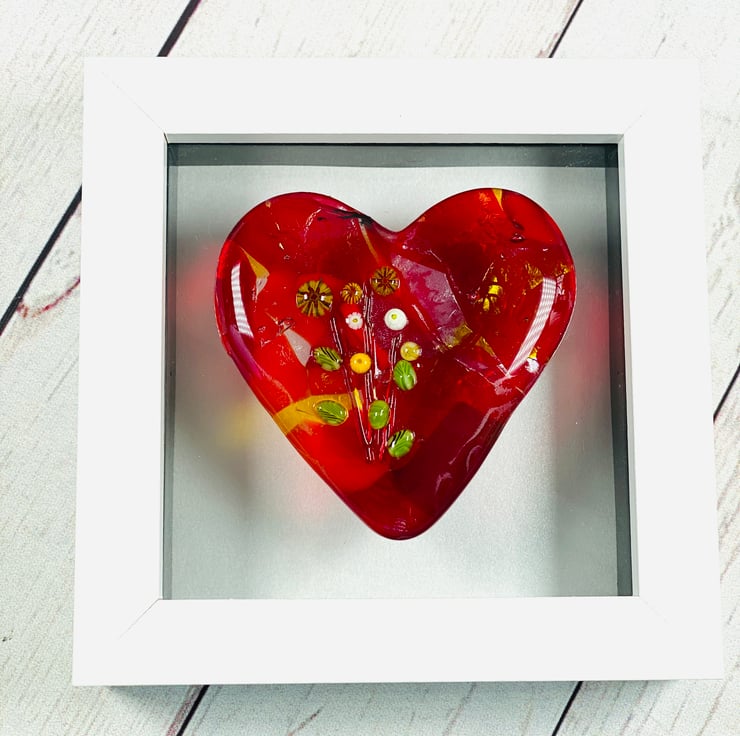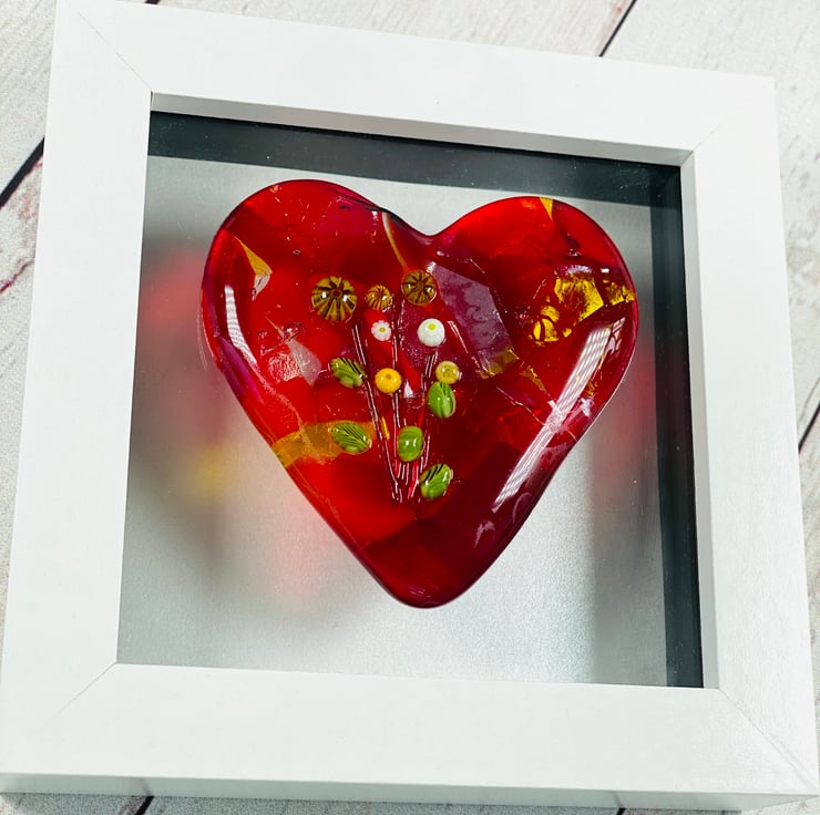 Fused glass heart picture created to give a 3 d heart which appears to float . This stunning red heart has elements of iridescent glass in it and tiny flowers on the top - a beautiful fused glass picture that can either hang on the wall or be free standing . The picture is approx 12 cm square . Perfect for gifting .