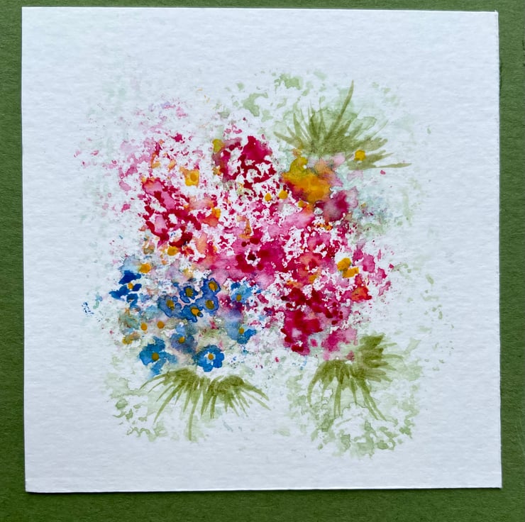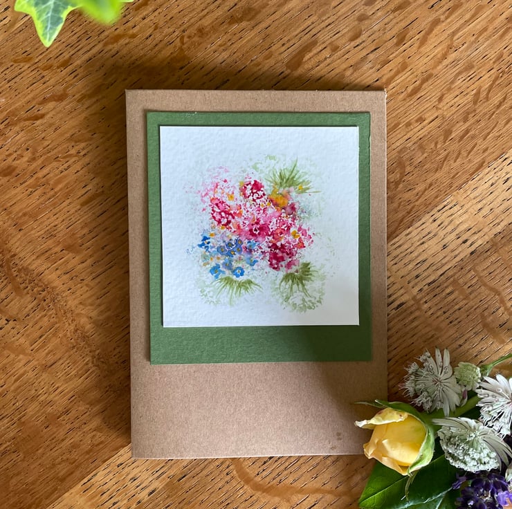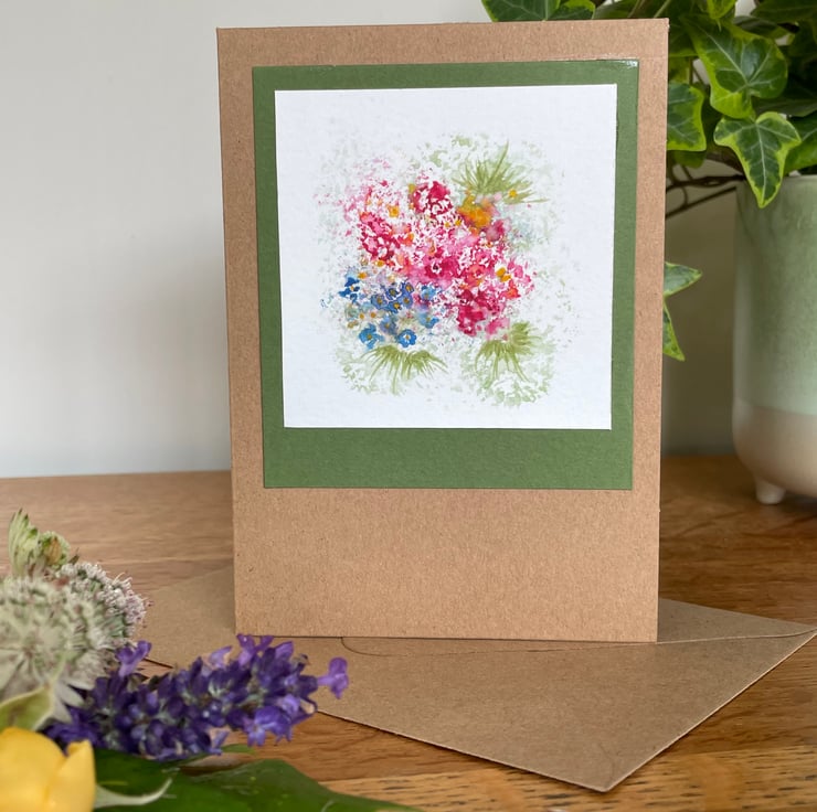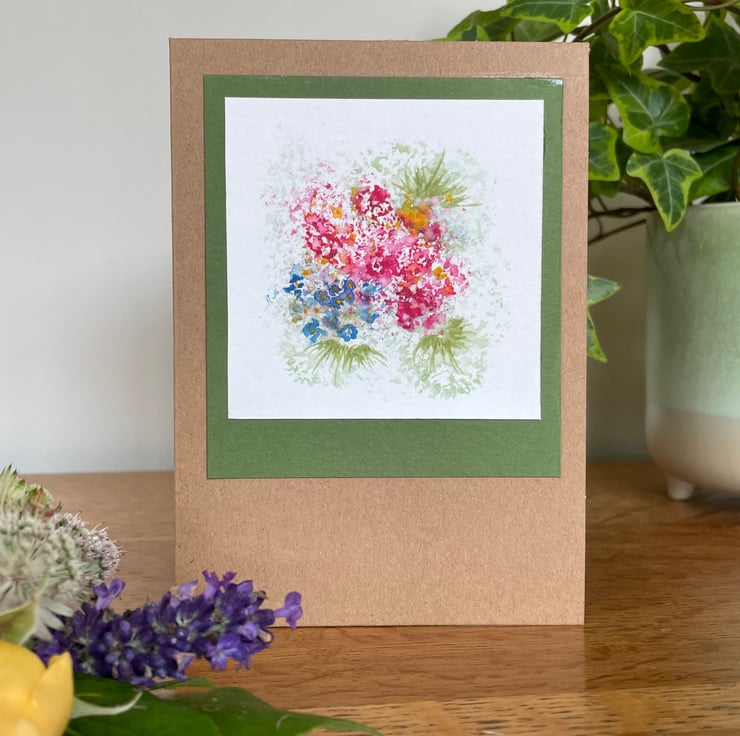 Hand painted floral watercolour card in my favourite pinks and blues, the original artwork is impressionistic in style and features an explosion of flowers surrounded by foliage, it has then been mounted onto complimentary coloured olive card prior to being mounted onto a brown recycled card and is left blank for any occasion or even framed as a tiny piece of affordable art as many of my customers do.