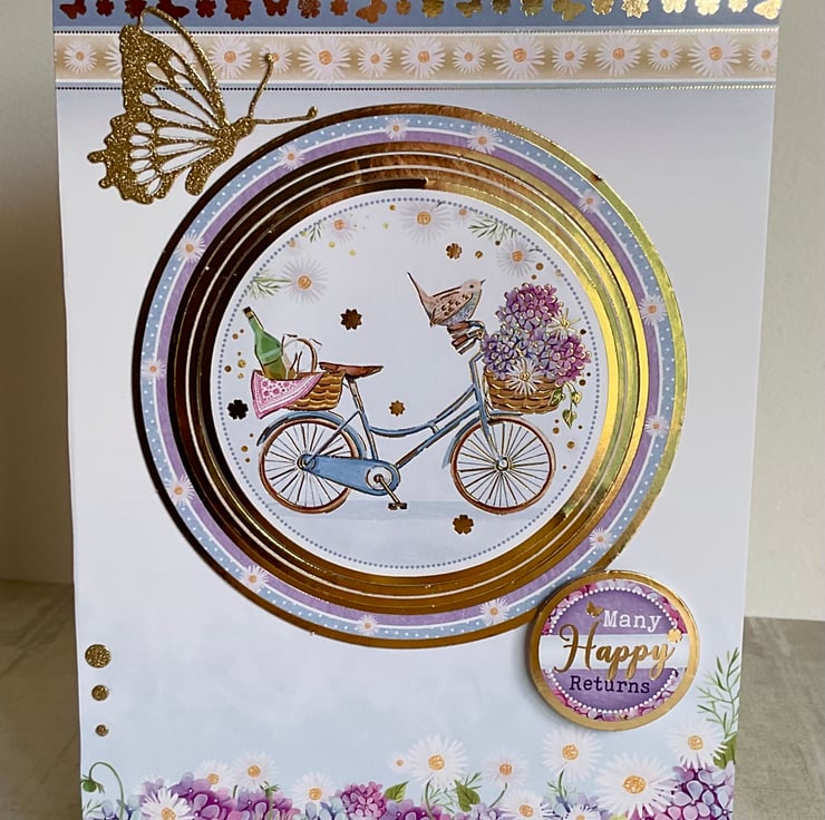 The card has been decorated with a topper featuring the words Many Happy Returns.