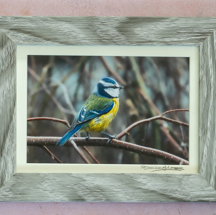 This is an original framed photo of a blue tit that I took while it was perched in the top of a tree in my garden.