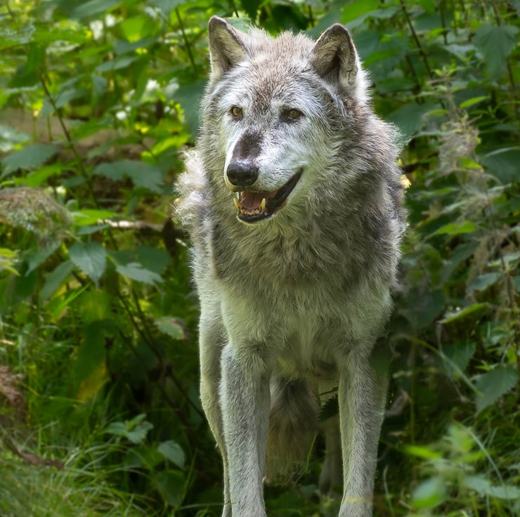 Original photo of a grey wolf emerging from the bushes. I took the photo in June 23 at the New Forest Wildlife Park in Hampshire, UK.