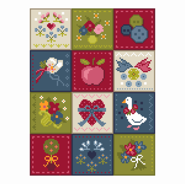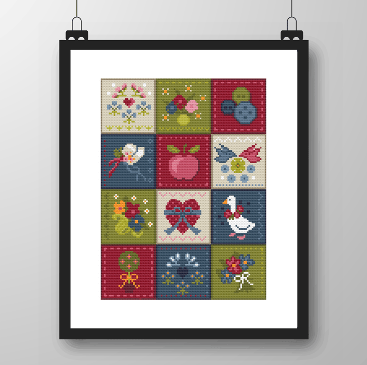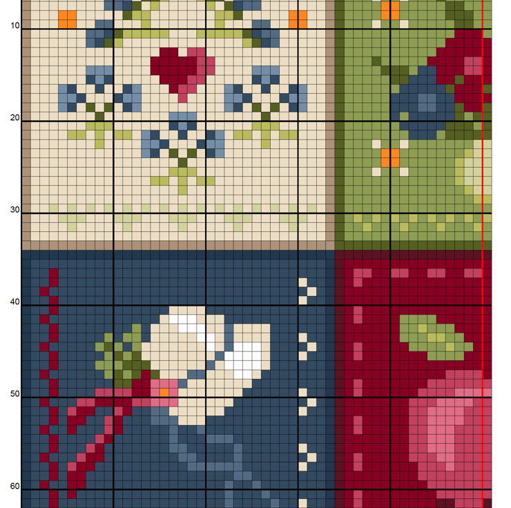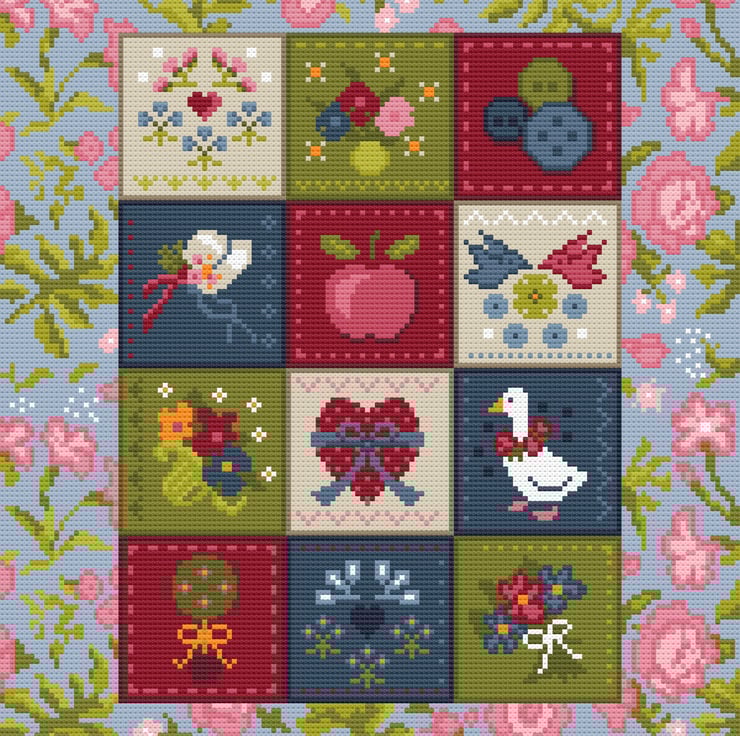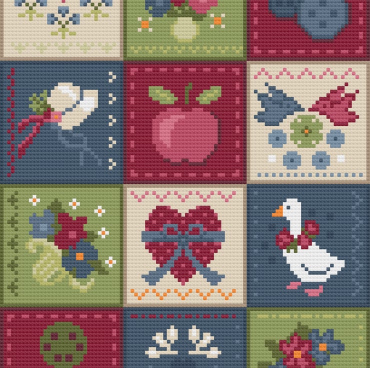 From my love of quilting, this American style quilt design in lovely bright colours and traditional symbolism cross stitch and tapestry chart using just 13 colours. See alternative version with floral border.