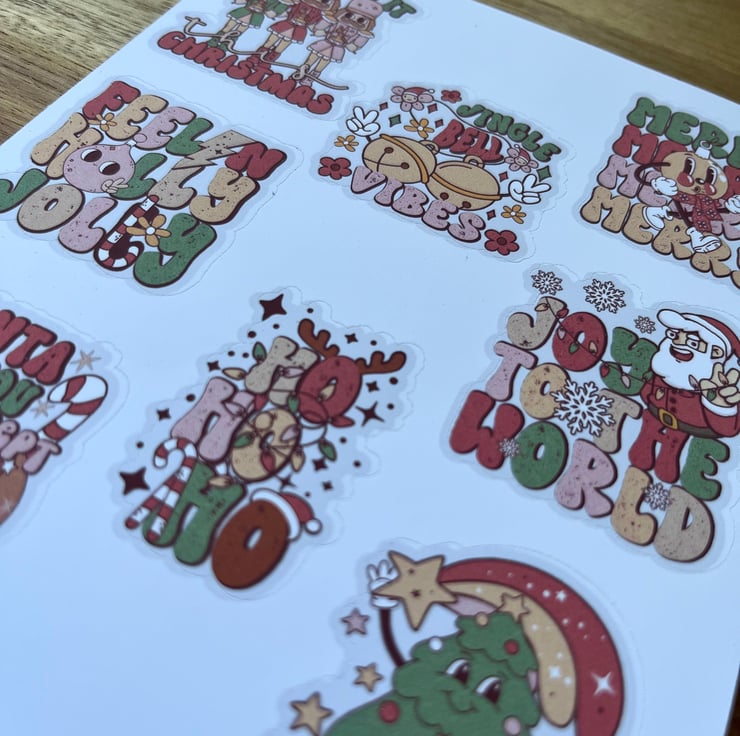 A sheet of handmade retro traditional Christmas themed stickers.