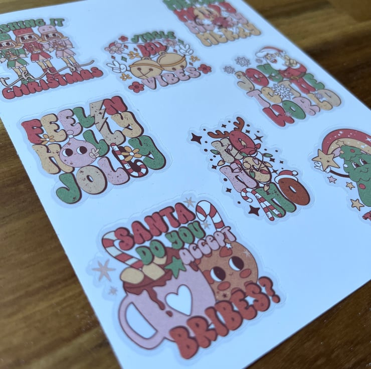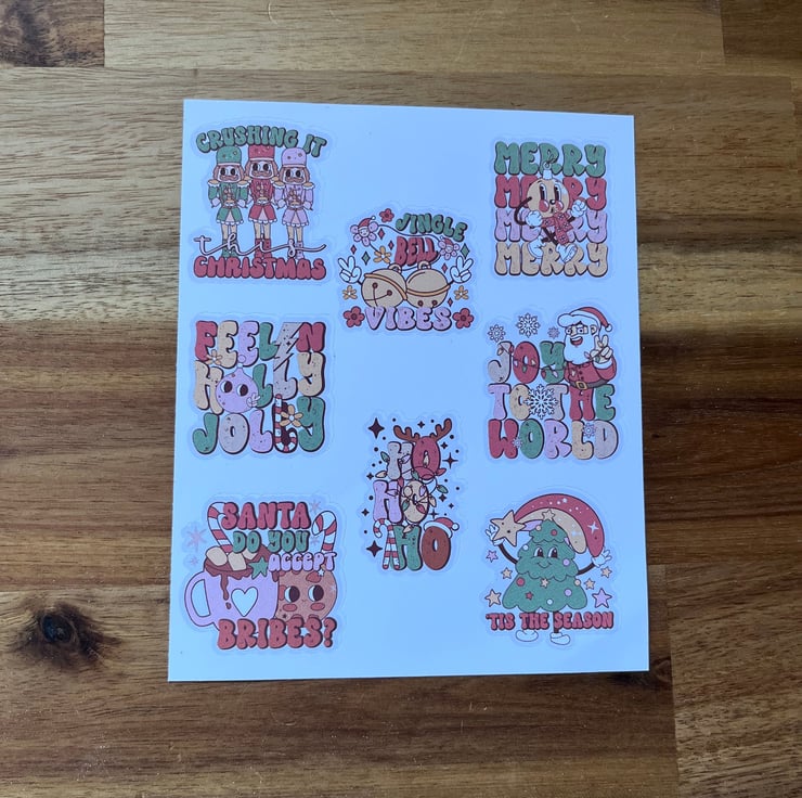 8 different Christmas stickers on each sheet.