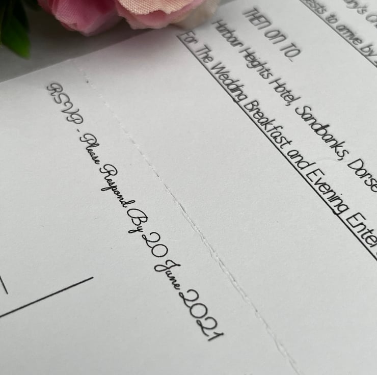 This tri-fold wedding invitation with RSVP is printed double sided and features a perforated edge which enables guests to easily detach the RSVP card to send back to you!