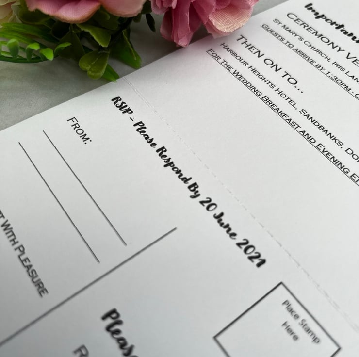 This tri-fold wedding invitation with RSVP is printed double sided and features a perforated edge which enables guests to easily detach the RSVP card to send back to you!