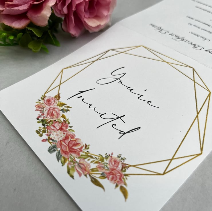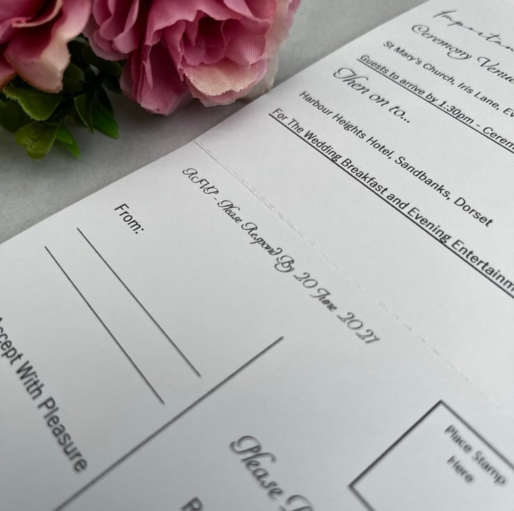 This tri-fold wedding invitation with RSVP is printed double sided and features a perforated edge which enables guests to easily detach the RSVP card to send back to you!