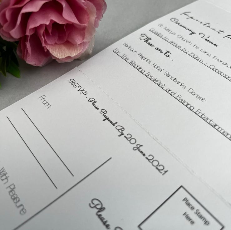 This tri-fold wedding invitation with RSVP is printed double sided and features a perforated edge which enables guests to easily detach the RSVP card to send back to you!