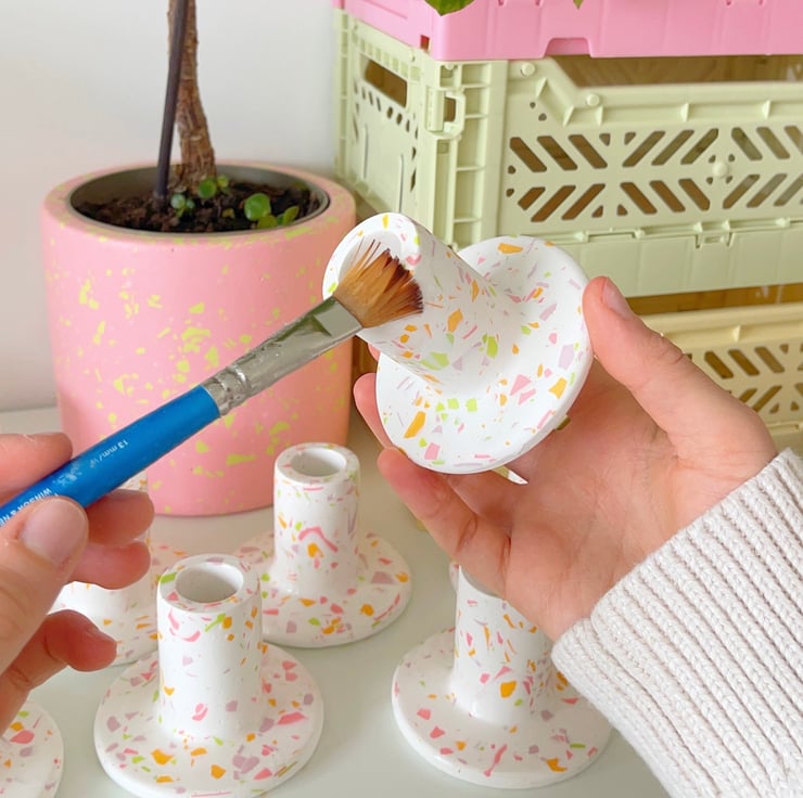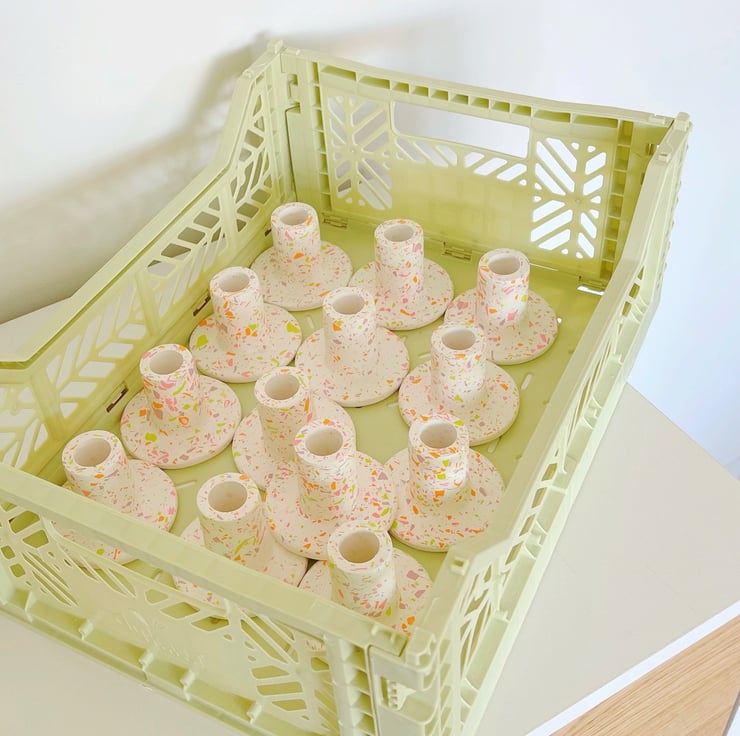Please note: each terrazzo candle holder is handmade from start to finish, so please allow for some tiny variations in colour and style, each holder is completely unique and this is celebrated as part of the design.