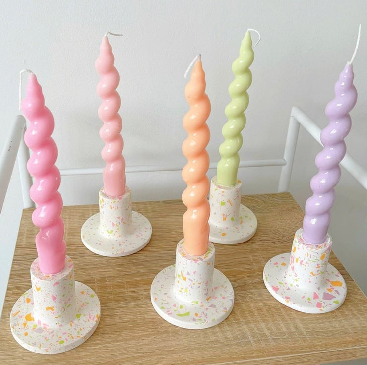 Taking inspiration from classic terrazzo surface design, these candle holders are the perfect way to add a splash of colour to your home decor! Pair with a candlestick from emandtheterrazzo.com for the cutest combination! Handmade with an eco-resin called Jesmonite.