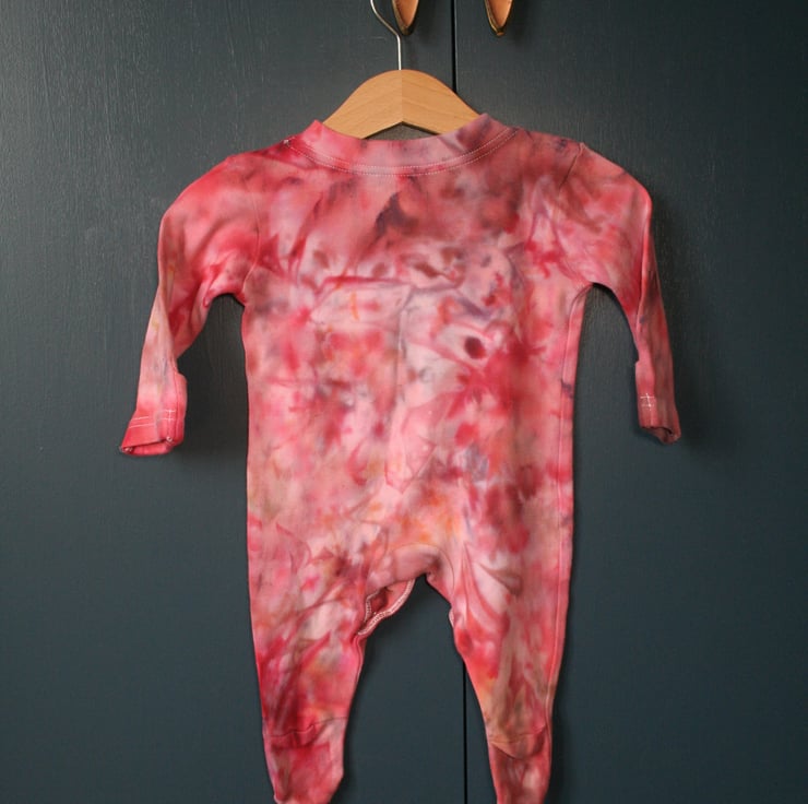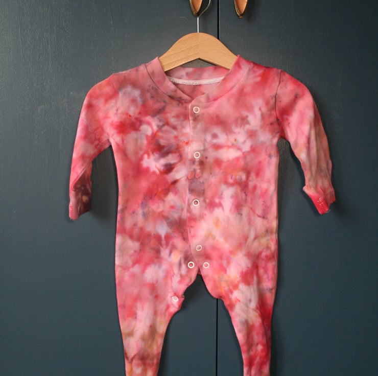 Ice-dyed technique used to create fabulous patterns and colours using red dyes. A very unique item! Newborn Size / 7.5lbs / 50cm. This is a second chance item.