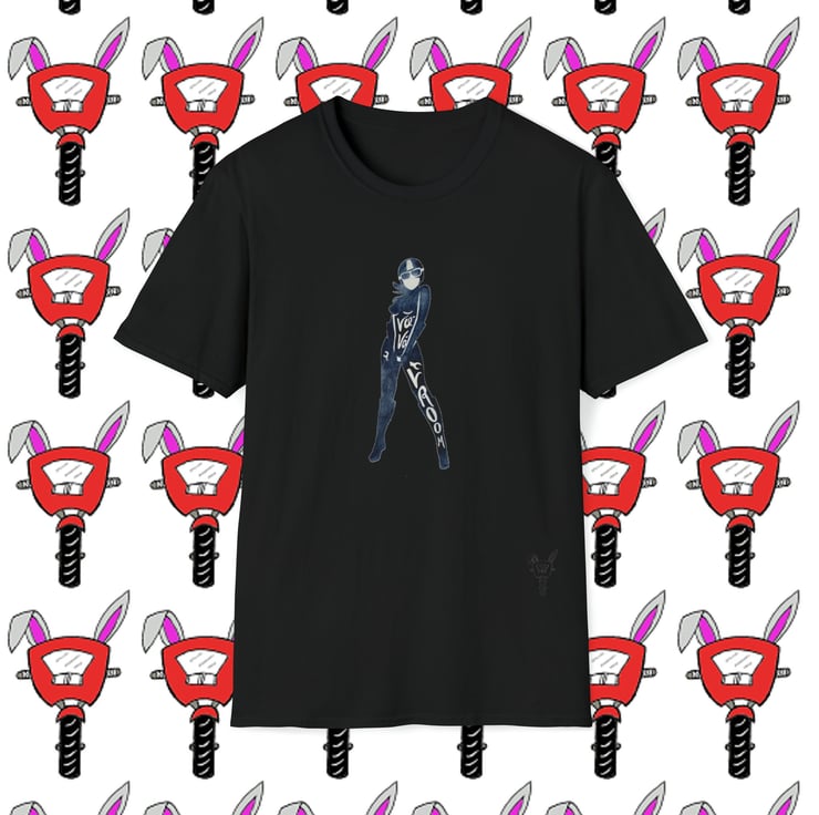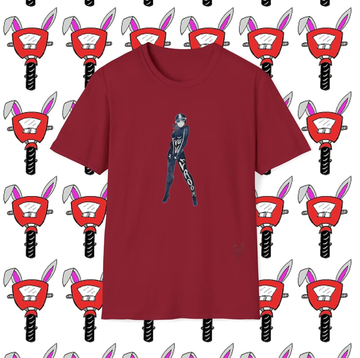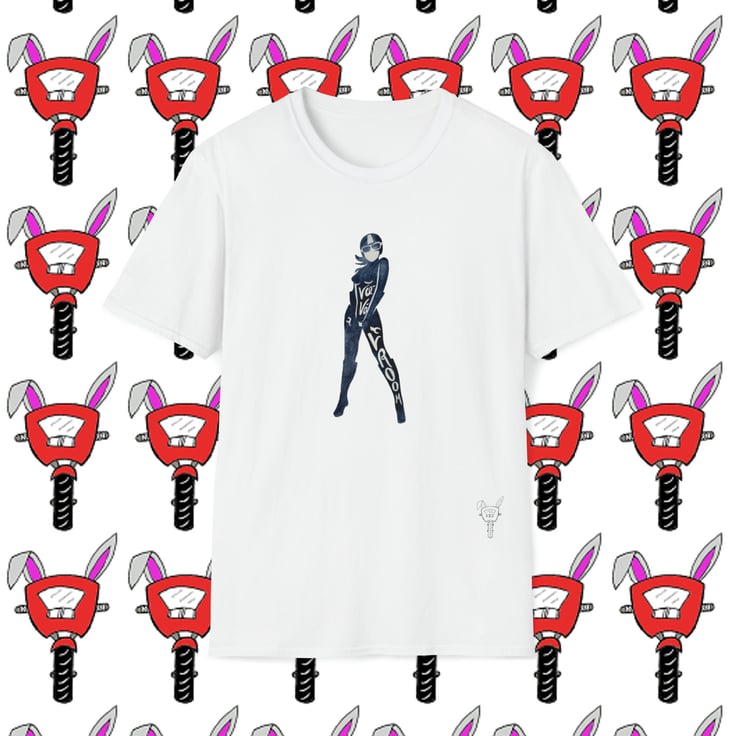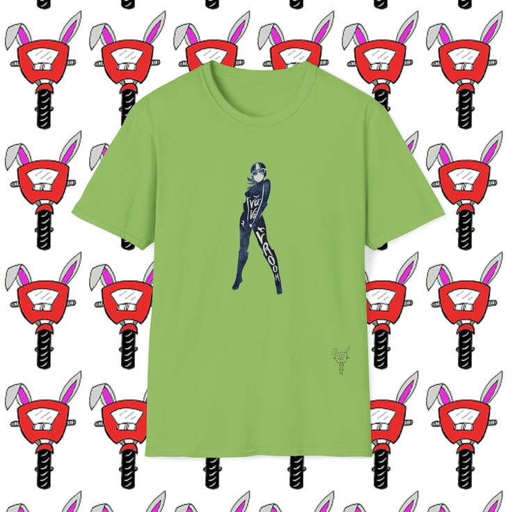 Va Va Vroom Biker 1 design. This is part of my Bikers Collection - please see my other designs. The unisex soft-style t-shirt puts a new spin on casual comfort. Made from very soft materials, this tee is 100% cotton for solid colors. The shoulders have twill tape for improved durability. There are no side seams. The collar is made with ribbed knitting to prevent curling damage.