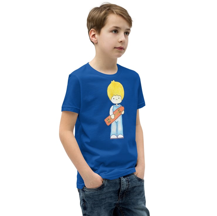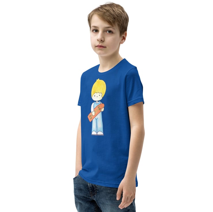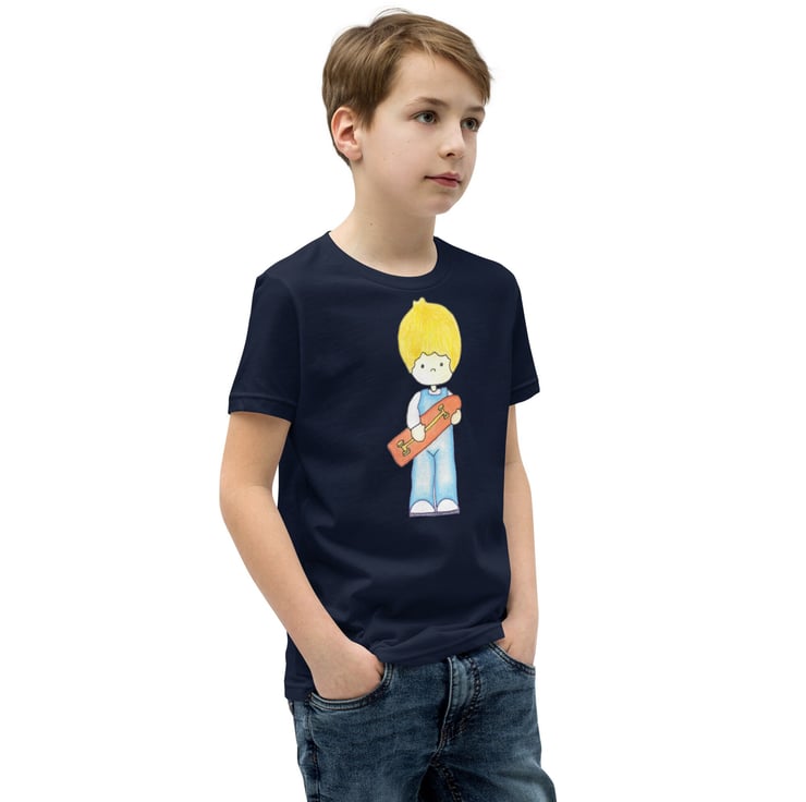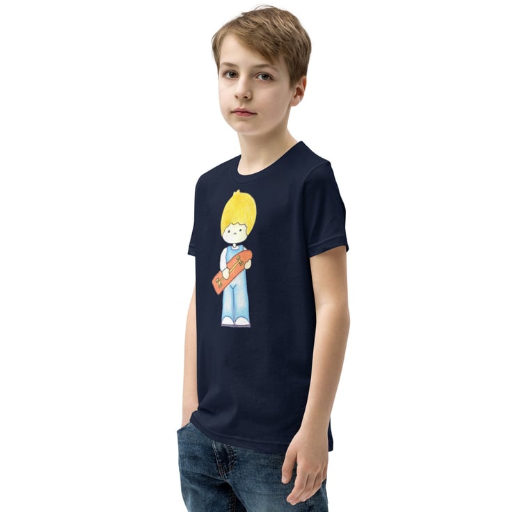 Cute Skater Boy wearing his dungarees and carrying his red long board skate board with yellow wheels trucks. This original and unique design has been created by me - Bikabunny, with coloured pencils and inks to give this design a soft shaded look. It's light, soft, and comes with a unique design that stands out from the crowd wherever you go!