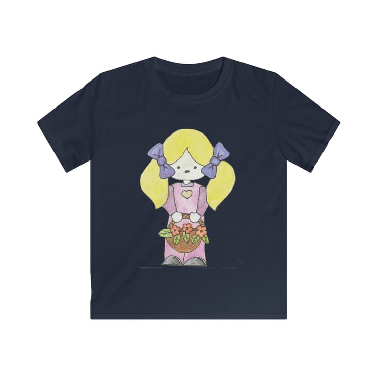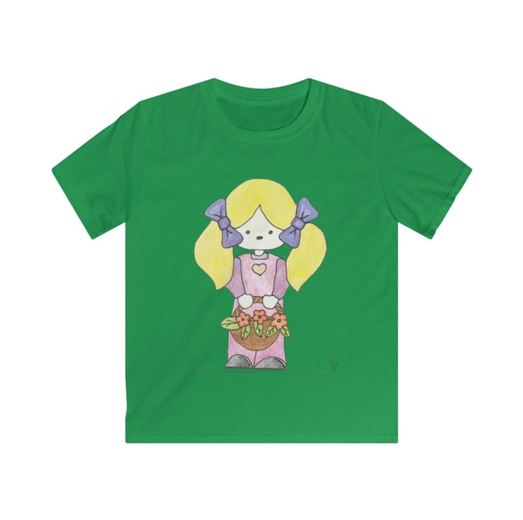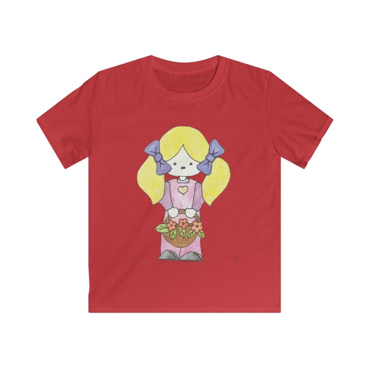 This cute little girl with golden hair and a basket of flowers. Created with coloured pencils by Bikabunny to give this design a soft shaded look. A special selection of softstyle yarns keep this shirt feeling great with every touch. Fine quality print makes it an irreplaceable item in every kid's wardrobe.