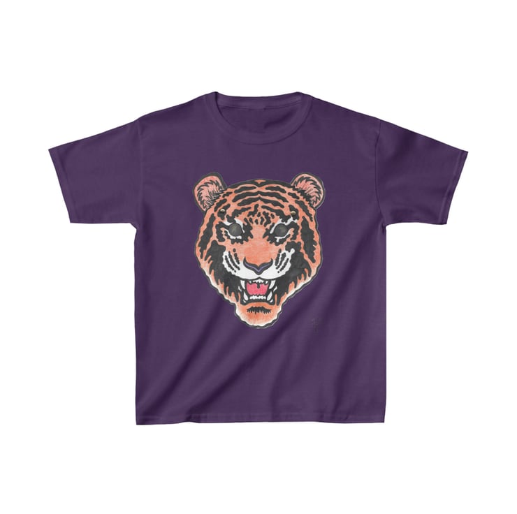 Tiger Face design hand drawn by Bikabunny. Colourful and original. This kids heavy cotton tshirt is perfect for everyday use. The fabric is 100% cotton for solid colours - polyester is included for heather-colour variants. The shoulders have twill tape for improved durability. The collar is curl resistant due to ribbed knitting. There are no seams along the sides.