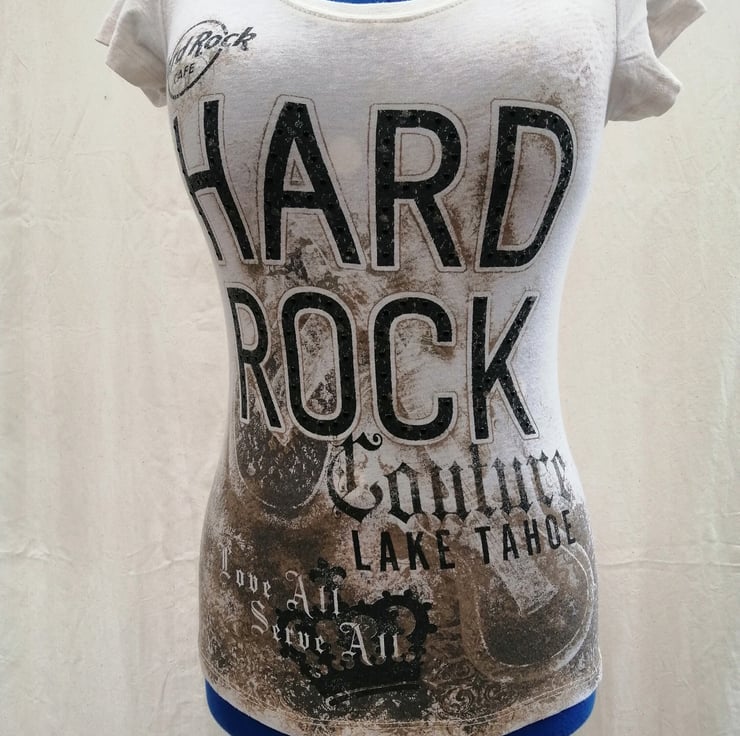 This is a Vintage 2000's Hard Rock Cafe Couture Lake Tahoe 'Love All Serve All' Top Tshirt Size Small