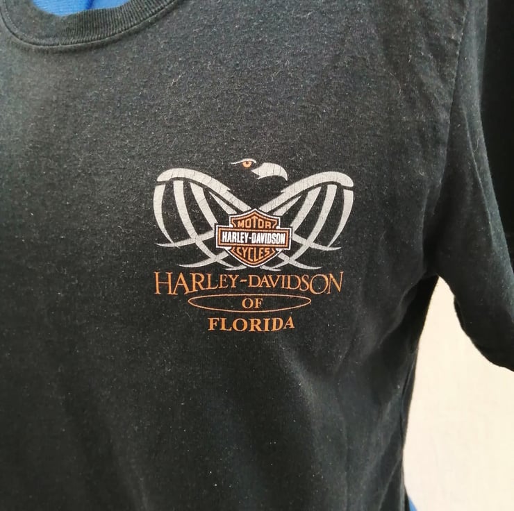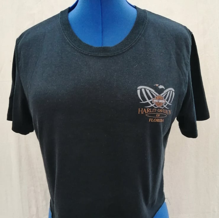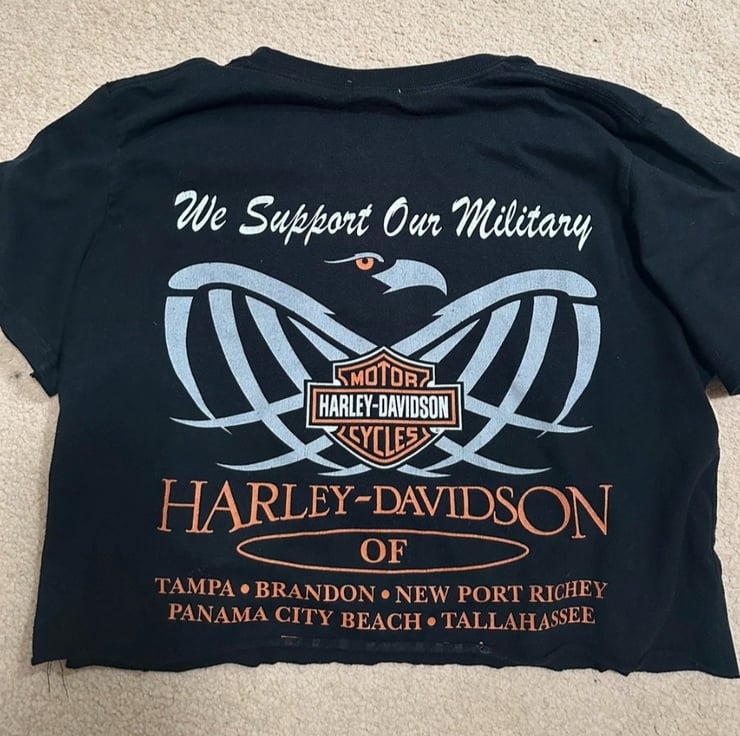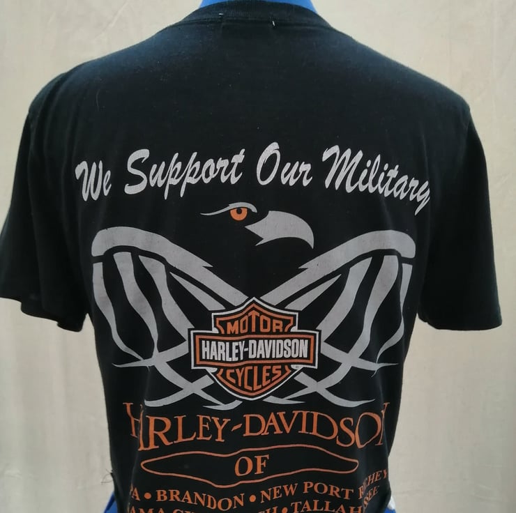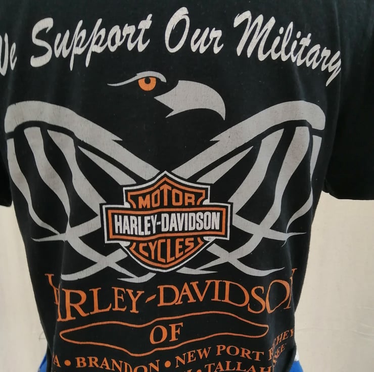 This is a vintage 1990's cropped tshirt from Harley Davidson Florida in 2XL. A great looking tshirt in good condition with a distinct design 'We Support Our Military' Eagle. It does have slight bobbling as shown in the pictures.