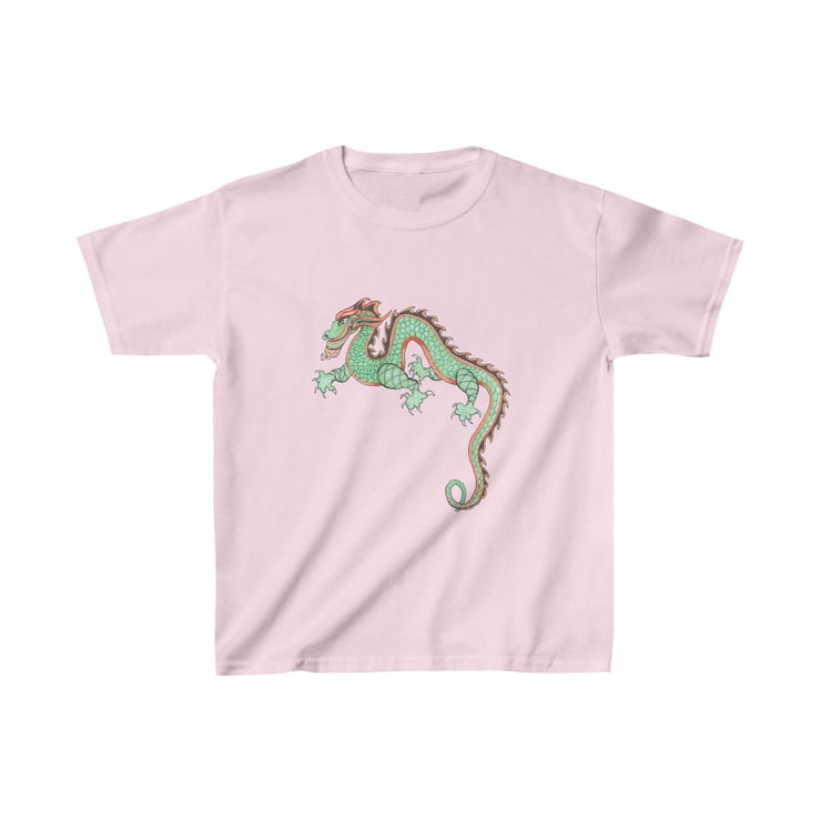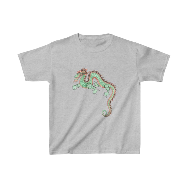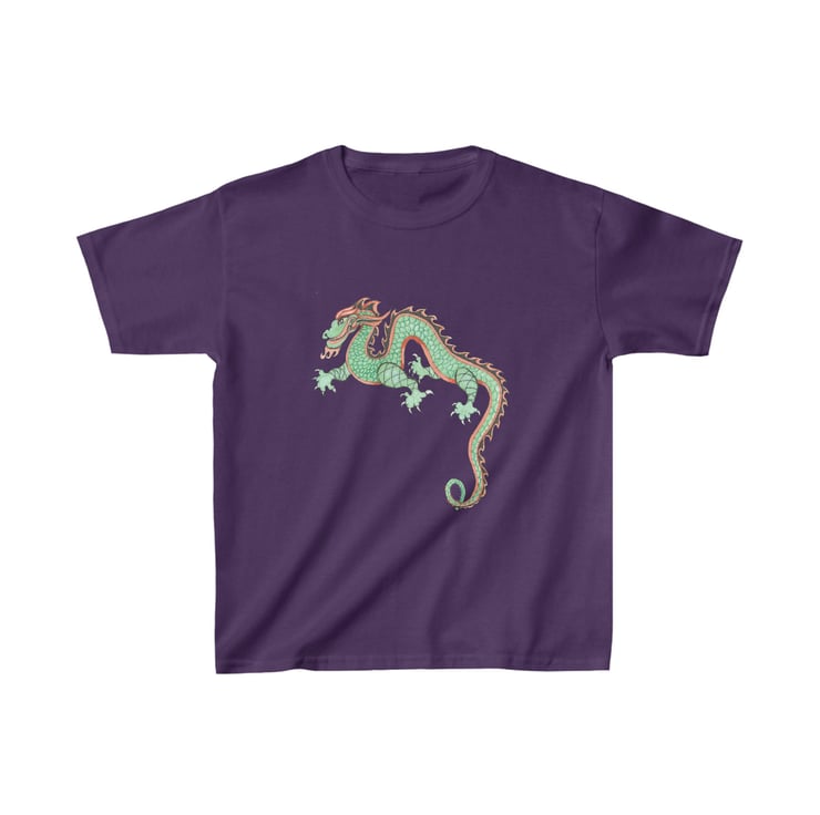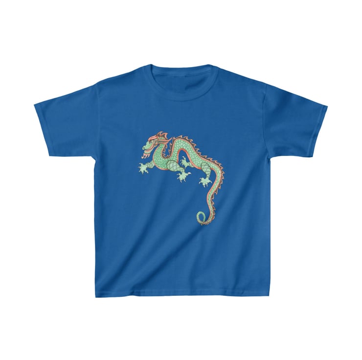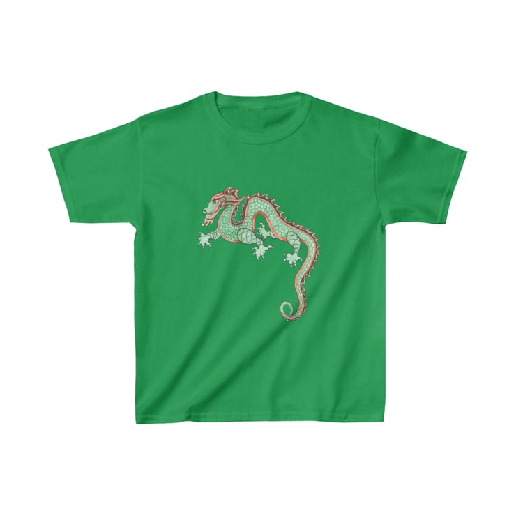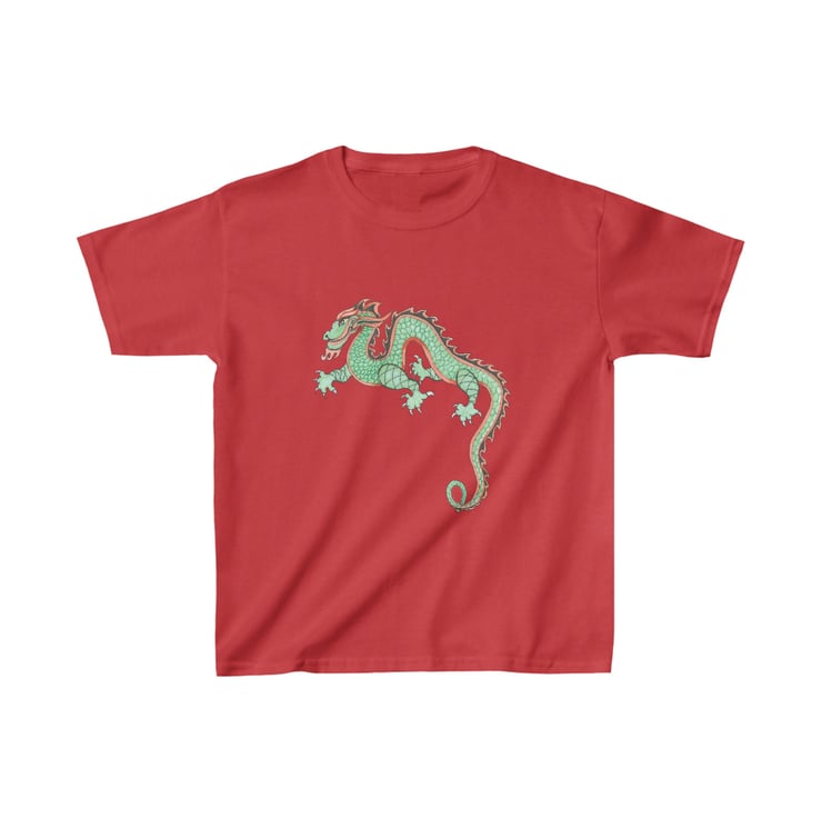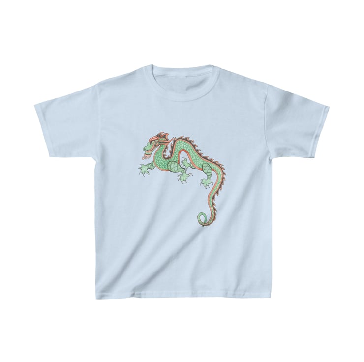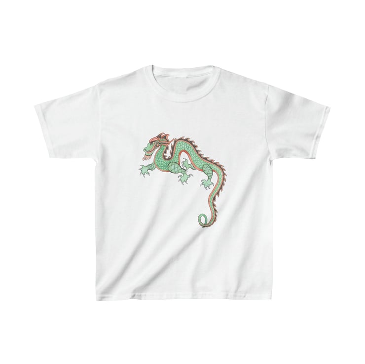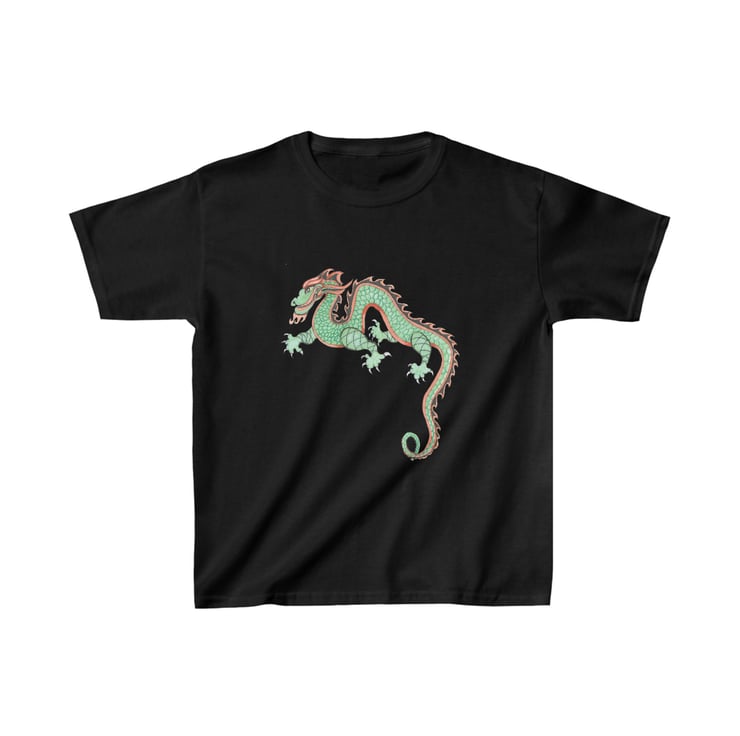 This colourful, fun looking green and red dragon is hand drawn by Bikabunny, making it original and unique. I used coloured pencils and inks to create this design. This is a Chinese Dragon which was drawn for the Chinese New Year Celebrations that we had in school one year. It was great fun to draw and we had a great day off timetable celebrating. This kids heavy cotton tshirt is perfect for everyday use. The fabric is 100% cotton for solid colors. The shoulders have twill tape for improved durability. The collar is curl resistant due to ribbed knitting. There are no seams along the sides making it comfortable to wear.
