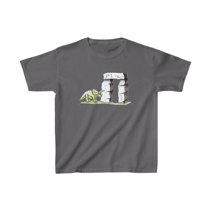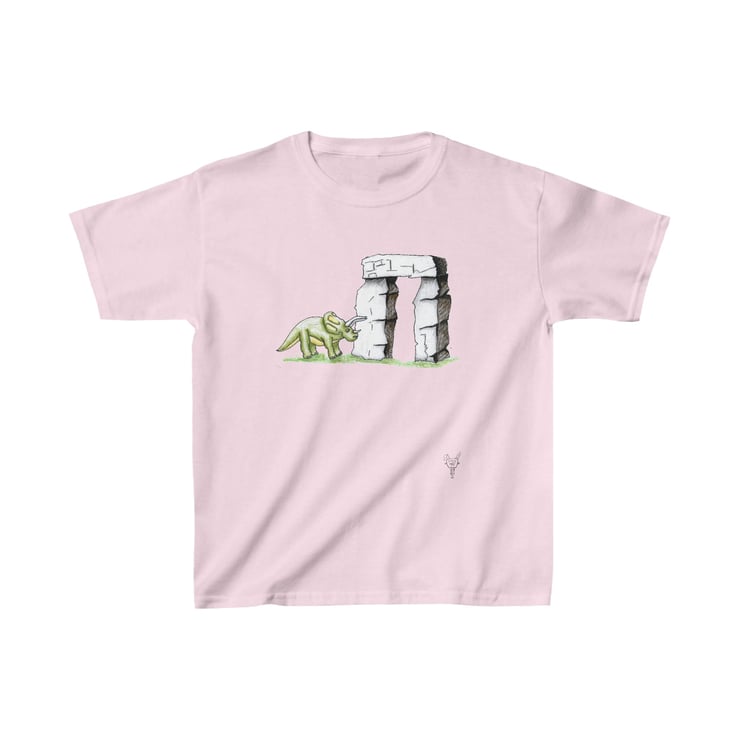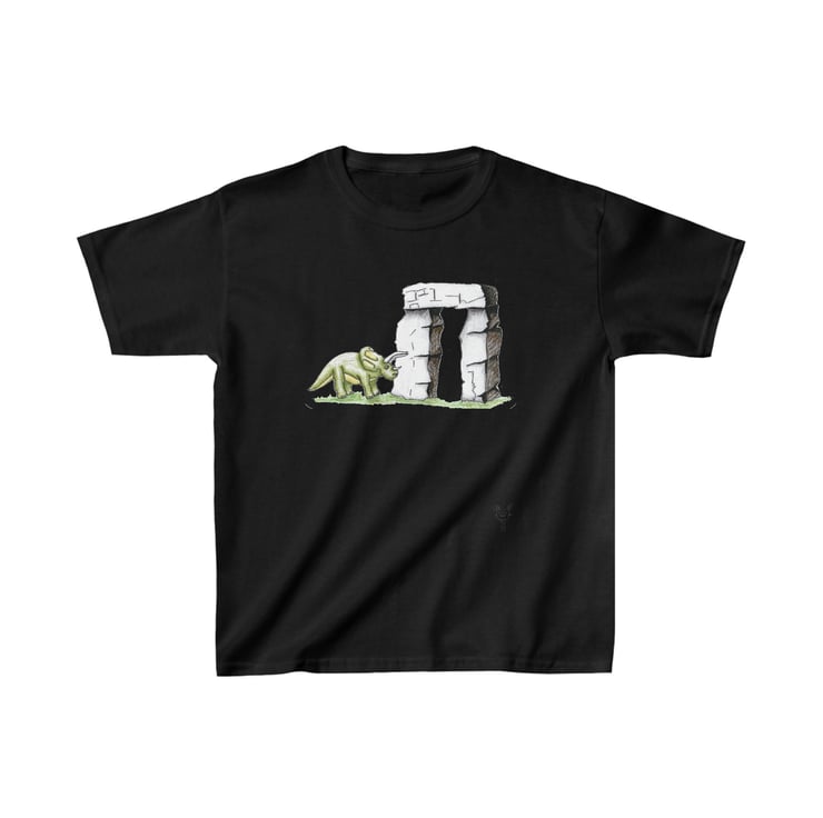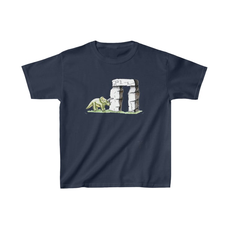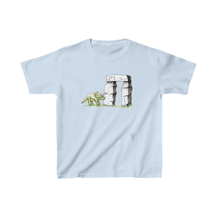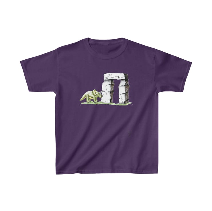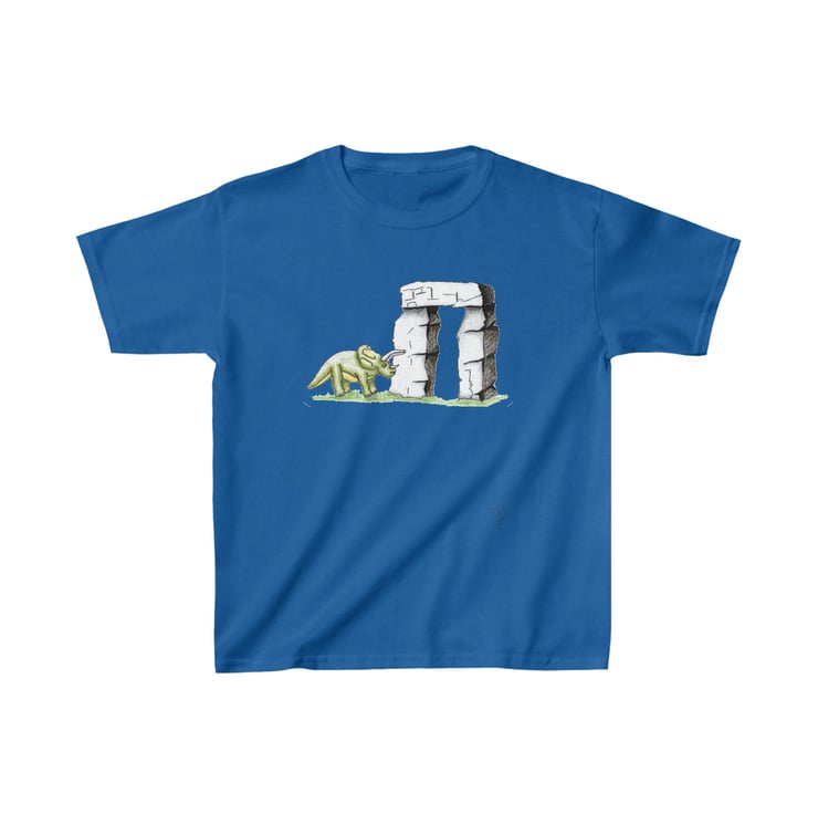 This is a triceratops dinosaur which has been hand drawn by Bikabunny using coloured pencils and inks. The dinosaur is standing by one of the massive Stonehenge blocks. It is an original and unique design printed into this kids heavy duty cotton tshirt making it perfect for everyday use. The printing process used for my designs means it will not fade, peel off or crack, even after being washed over and over again.