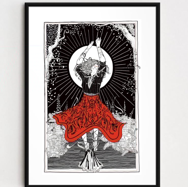 This is an A4 art print of my original pen and ink illustration. It’s a piece of art illustrating a Romany woman dancing around a bonfire, wild and free, abandoned from all her worries alone and under the full moon. As her red skirt billows under the night sky, the detailed folk art inspired pattern on it is highlighted! This high quality print is available in an A4 size and printed onto 240gsm paper using a Giclee printer to give the highest quality version of the wall art as possible.