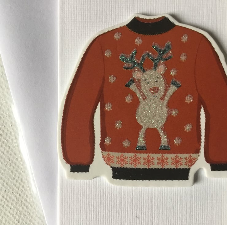 This christmas jumper card has a knitted reindeer on the front, dancing in the snow.