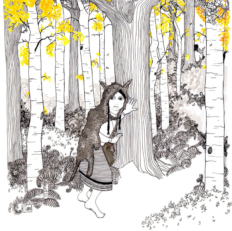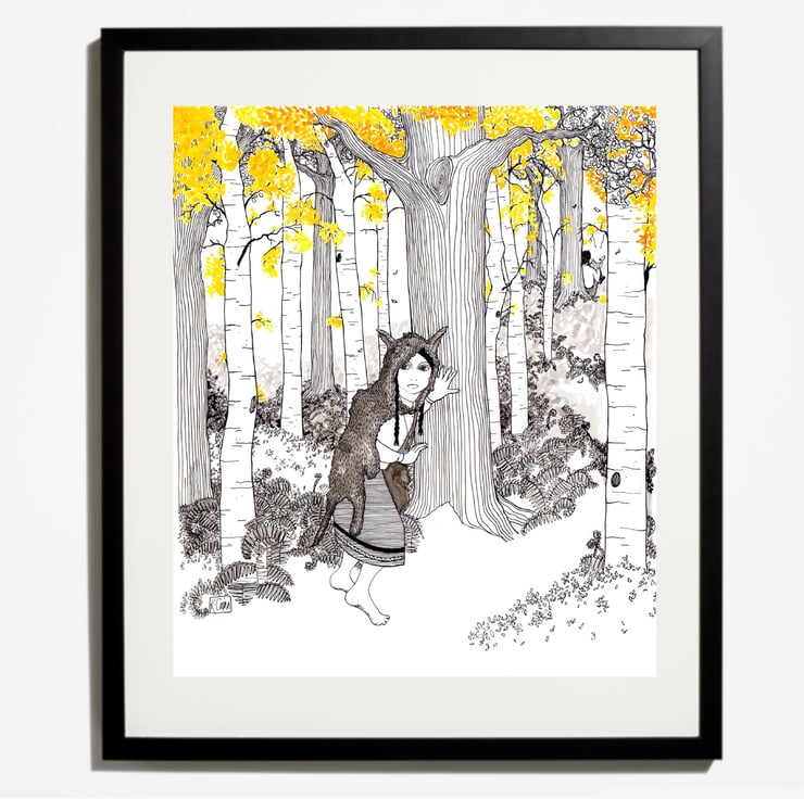 This art print of a wild, barefoot girl hiding in the woods will appeal to any tree and woodland lover. The pen & ink drawn folk tale character reflects an eclectic & bohemian style, whilst still looking modern with it’s simple line work. This high quality print of my original drawing is available at 10x12” in size & printed onto 240gsm paper using a Giclee printer to give the highest quality version of the print possible. The art print would make a great addition to any child’s bedroom, lounge, bedroom or office, making a captivating piece of art, reminiscent of a story book piece of illustration.