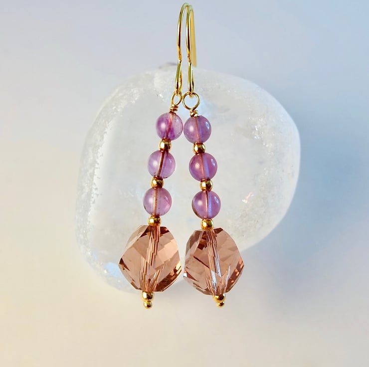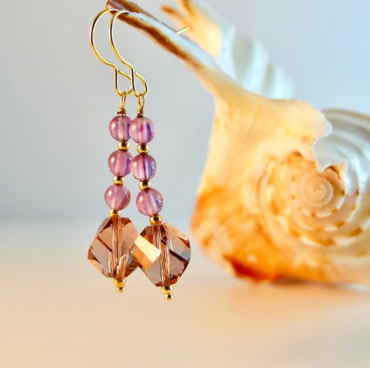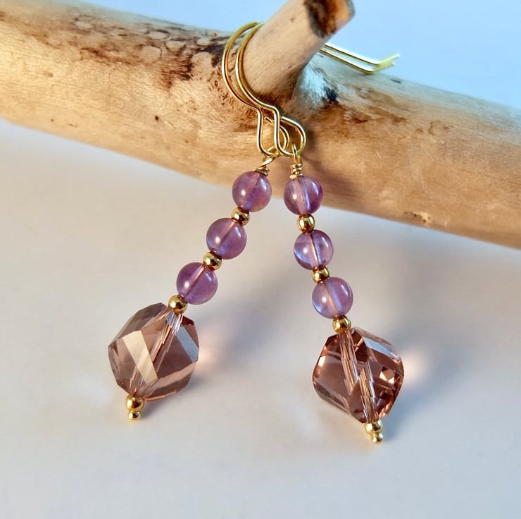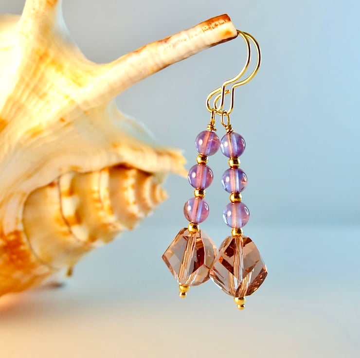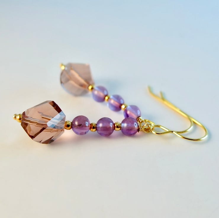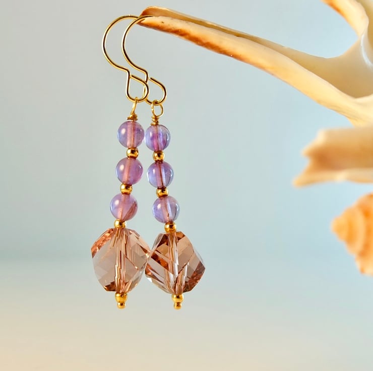 Each of these pretty earrings features a sparkly, 10mm, handmade, faceted crystal drop in a dusky amethyst colour, topped with a trio of 4mm purple Amethyst beads.