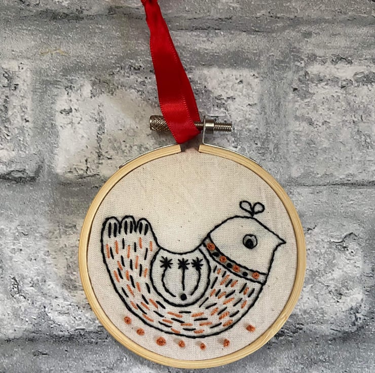 Taking motifs and inspiration from my illustrations and prints I have hand embroidered this adorable little folk art bird.