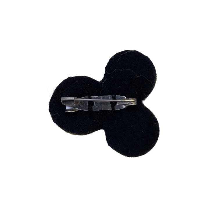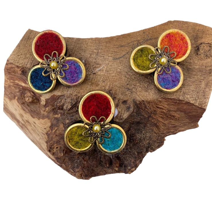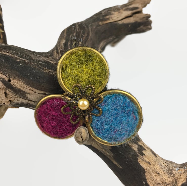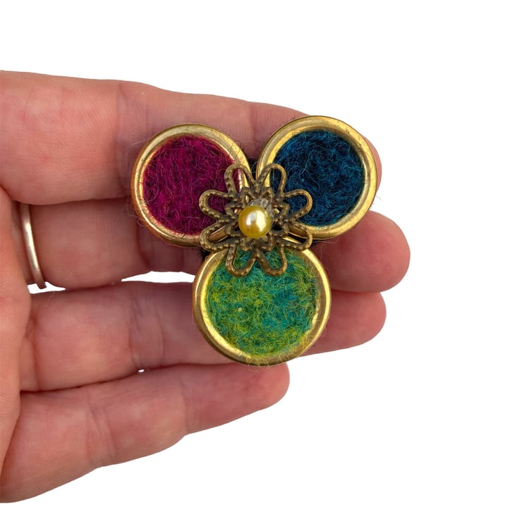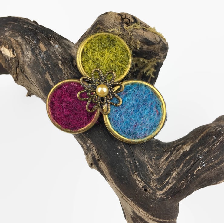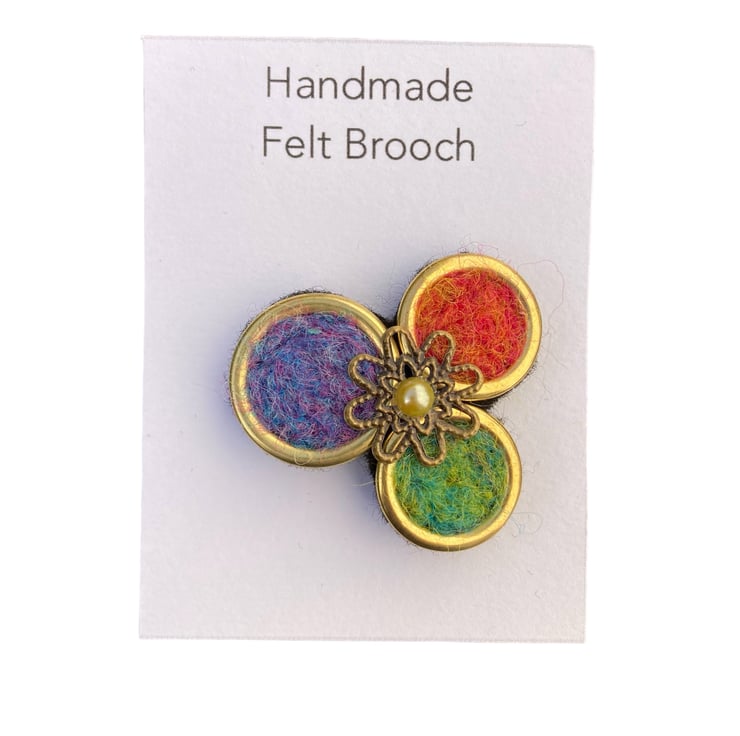 This brightly coloured brooch consists of three brass rings, in different sizes, mounted together on a piece of black felt with the centre of each ring needle felted using woollen fibres in bright colours. Additional decoration in the form of an "antique brass" coloured flower with a golden yellow half pearl centre has been mounted at the centre of the brooch. The back of the brooch is covered with black felt and a silver tone brooch pin attached.