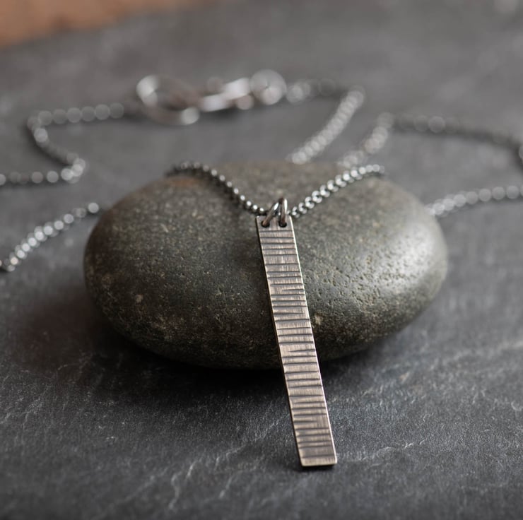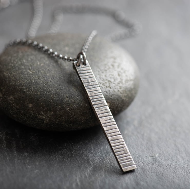 To make the pendant I have sawn out the bar shape from silver, and hammered lines onto one side. I think this gives it a lovely silver birch style effect.