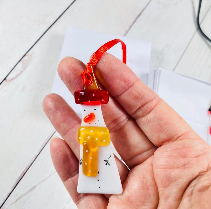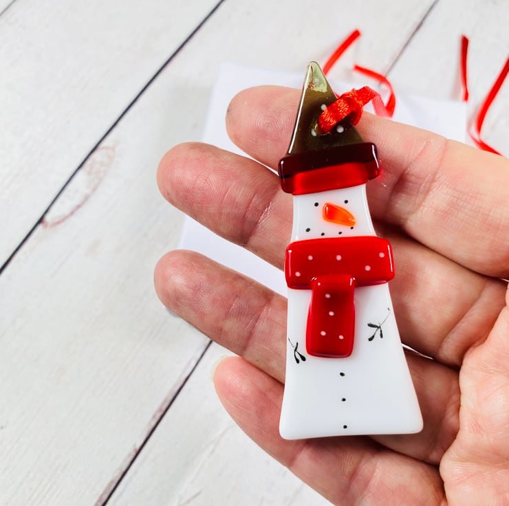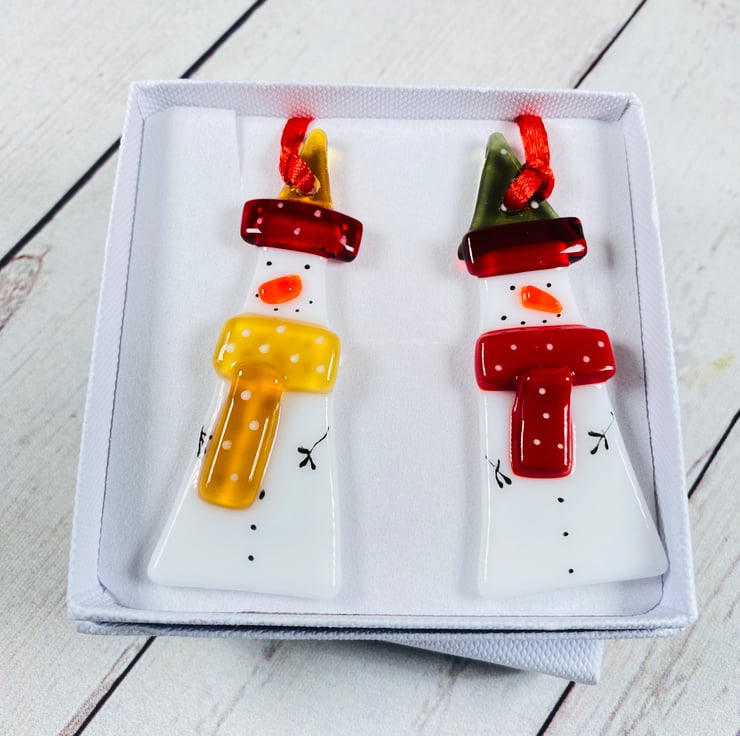 Fused glass snowmen in traditional colours of red, gold and green . Look lovely with sparkly Christmas lights on them . The pair come in a little white gift box - perfect if you’re gifting it for safe storage .