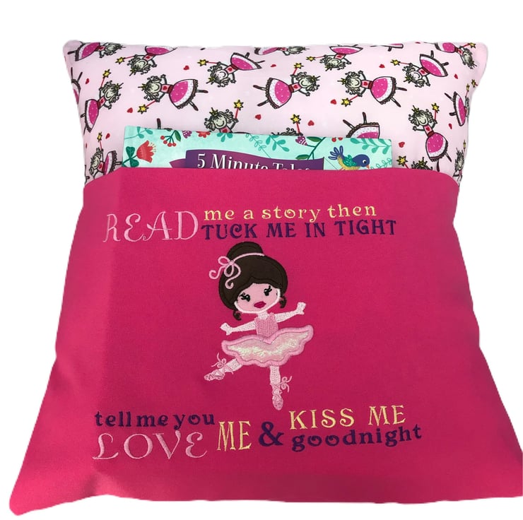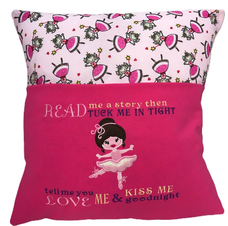 A handmade Reading Book Cushion made using a princess ballerina themed Fabric with added detail of an embroidered ballerina design.