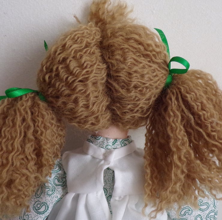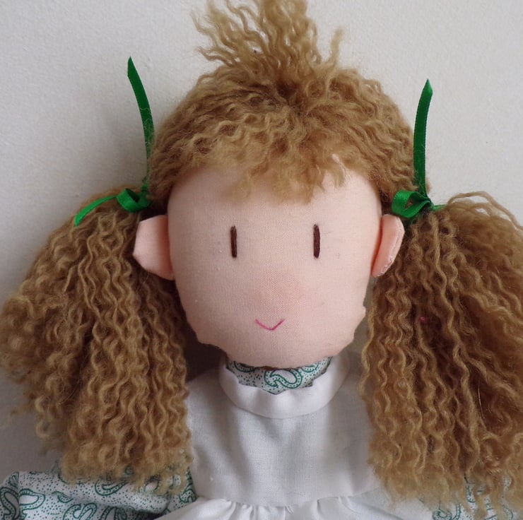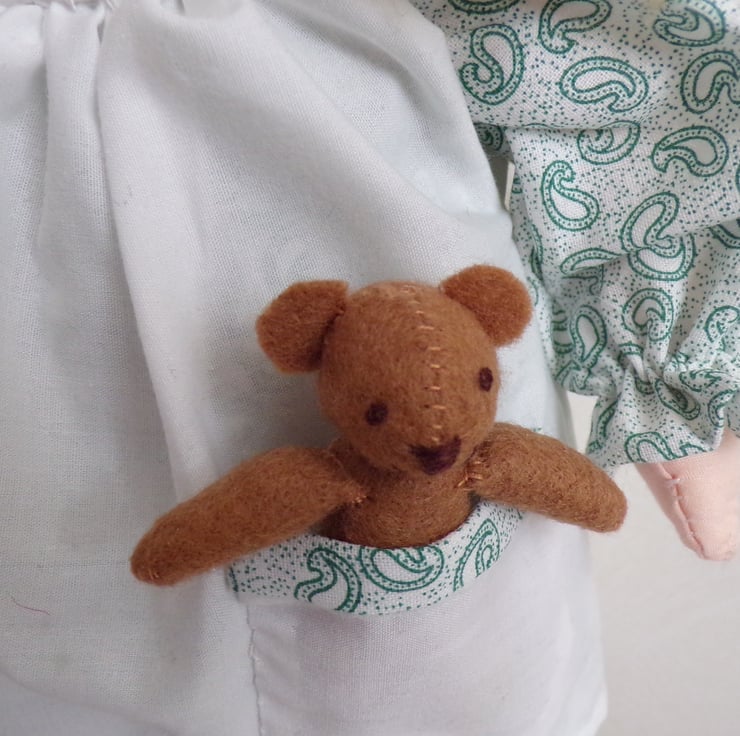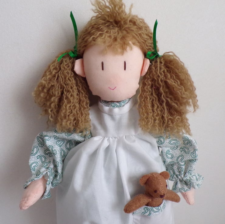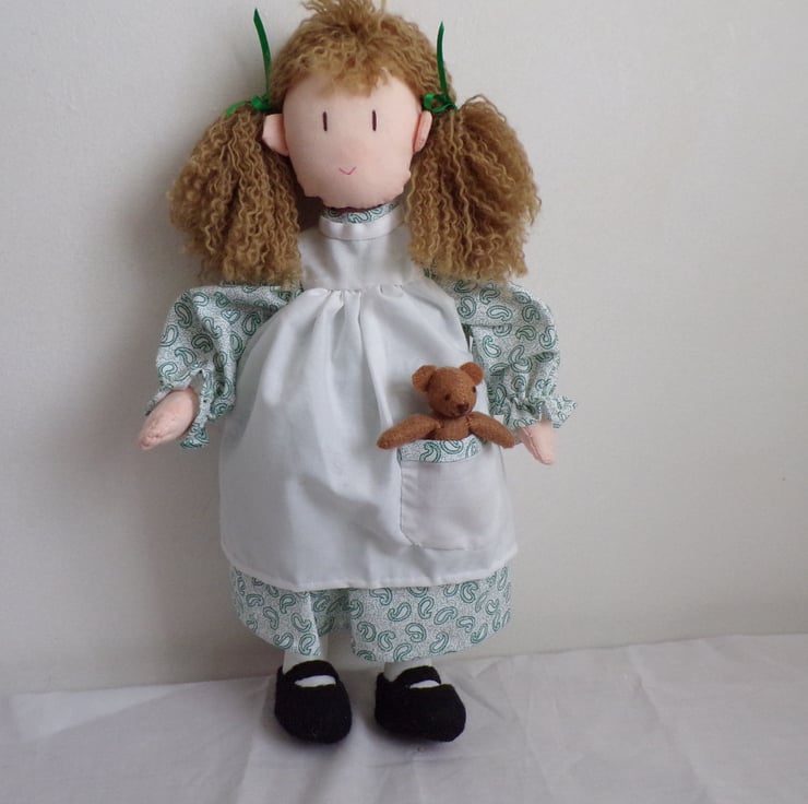 Emma is a beautiful 14 inch rag doll, perfect size for little arms to cuddle. She comes to you in a removable dress and apron, with fixed bloomers on under the dress, little black shoes and green ribbons in her hair. She carries a little teddy bear in her pocket made from felt. Emma is filled with polyester filling. A handstitched doll, made with love. Emma would make a lovely forever friend for the little (or big) person in your life.