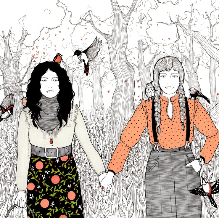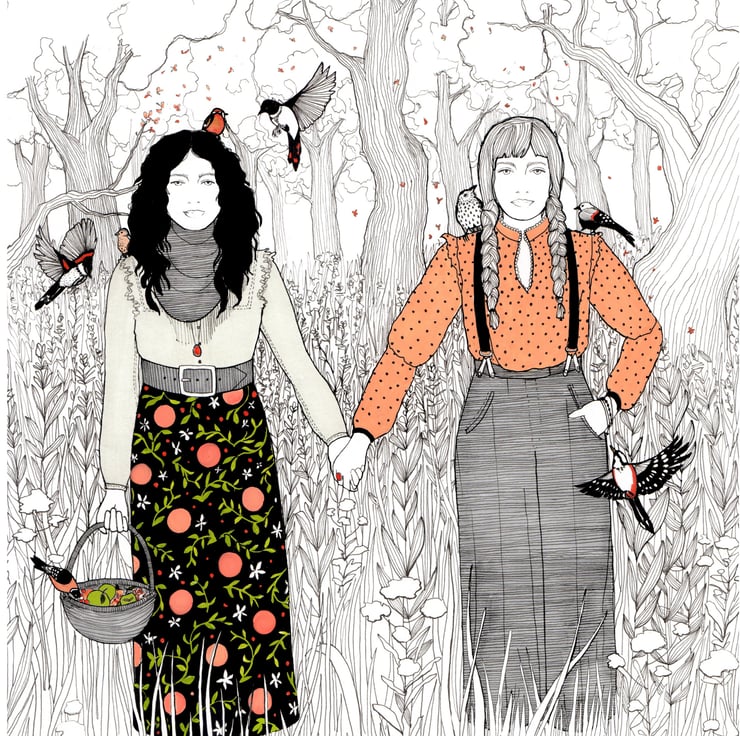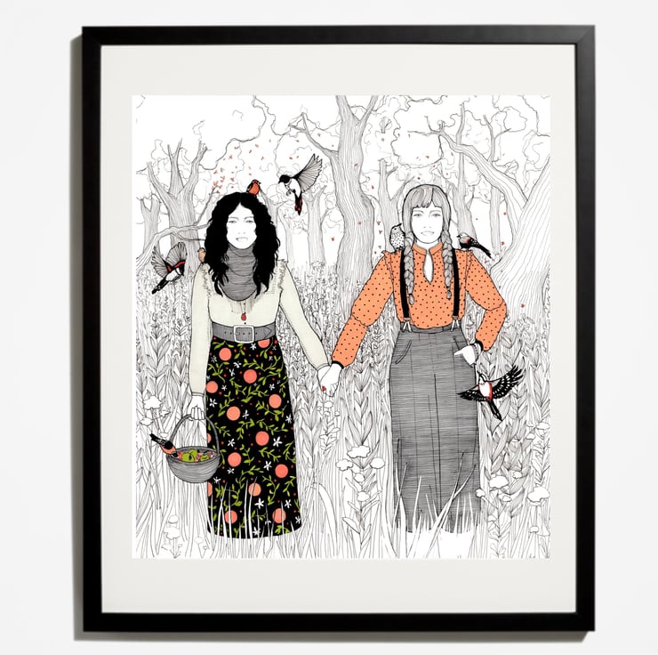 This beautifully, detailed art print of my original pen and ink drawing illustrates a tough pair of pioneer women. Their backdrop is a woodland scene of botanical details and beautiful trees, where the couple are so native to the woods, the birds land on them as if they were trees themselves. This piece of wall art makes a perfect gift for a wife, mother, same sex couple or friend. The high quality piece of illustration art is printed onto 240gsm paper, using a Giclee printer to give the very best version of the art piece possible.