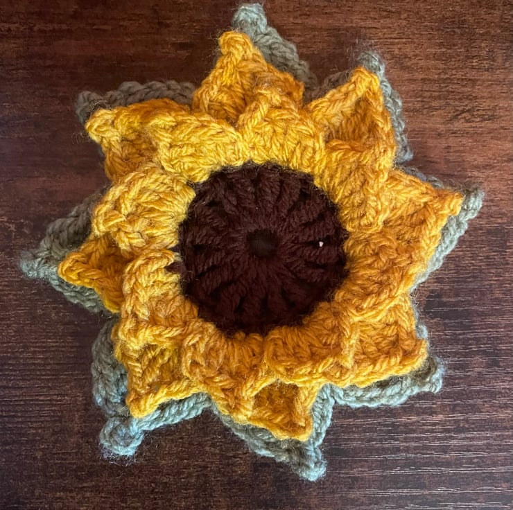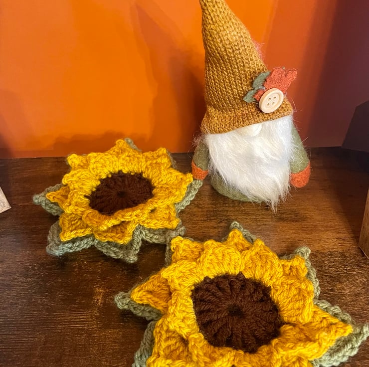 Each sunflower is crocheted with acrylic yarn in brown, golden yellow and green leaves. They measure approximately 14 cm in dimension.