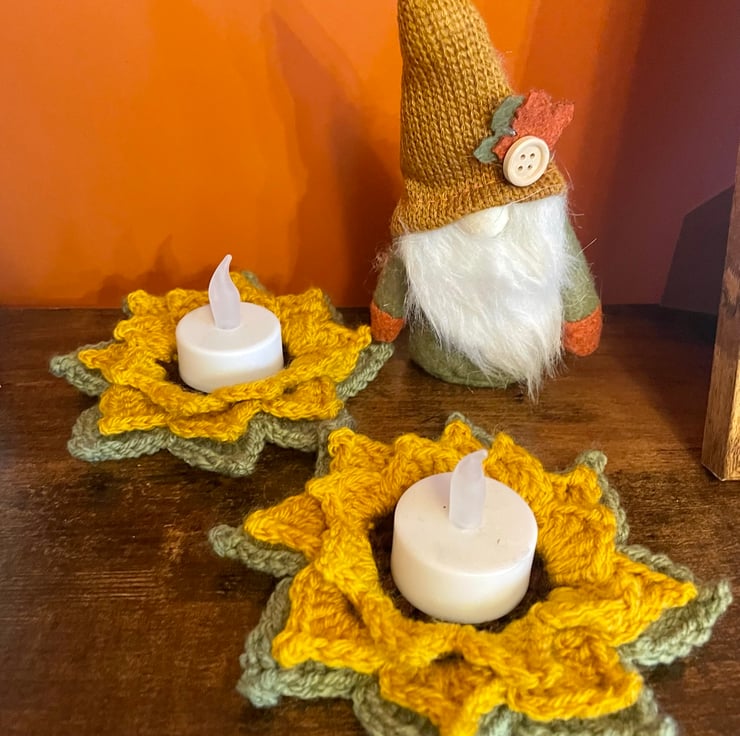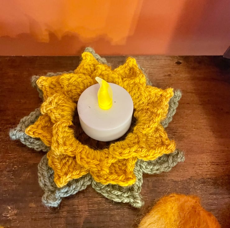 This beautiful crochet Sunflower holds a tea light in its centre to make a lovely Autumn table decoration.
