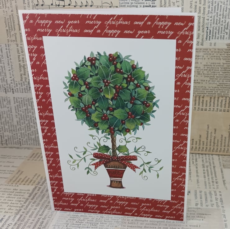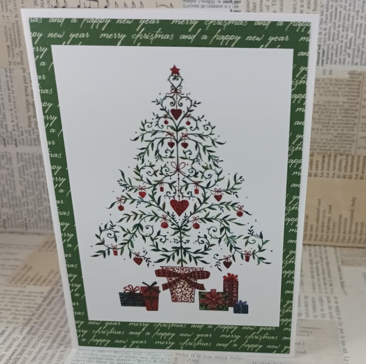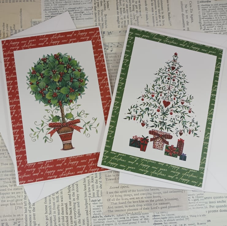 Pack of 2 Christmas cards, one of each design. One card has an image of a Christmas Tree with gifts underneath overlaid onto a green text background reading 'merry christmas and a happy new year'. The second card has a topiary holly tree in a pot overlaid onto a red background with the same text.