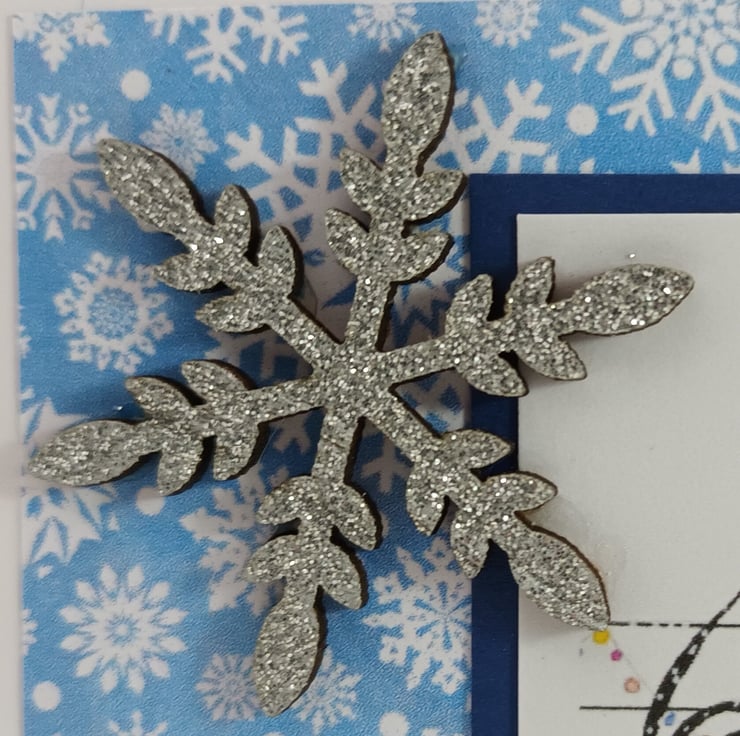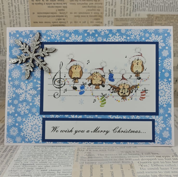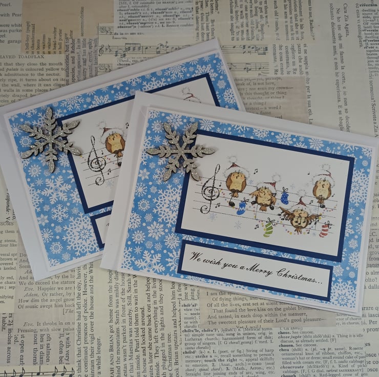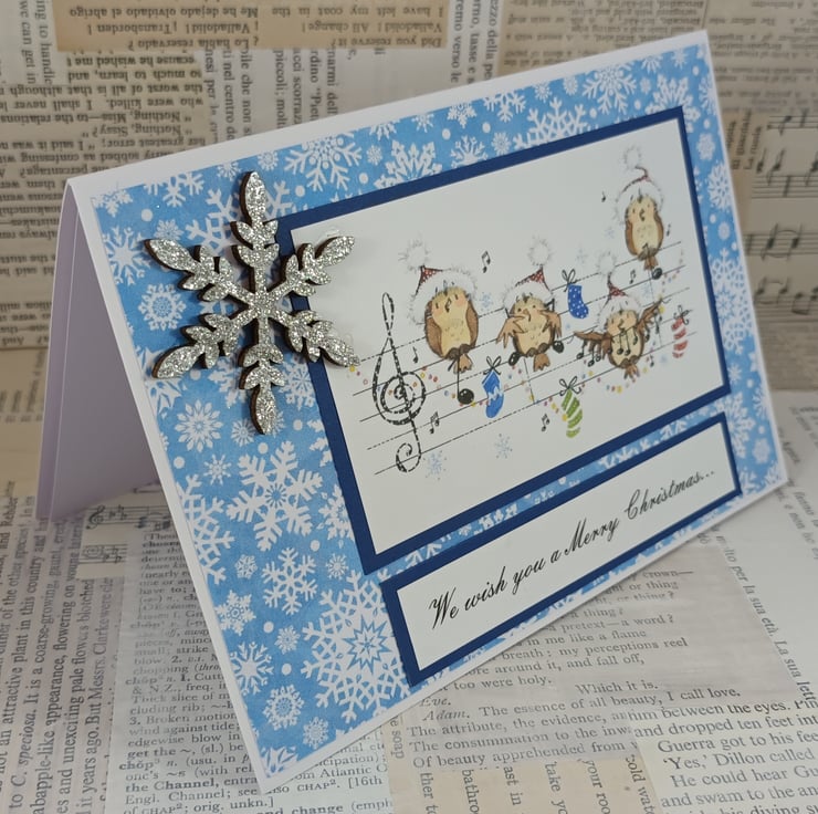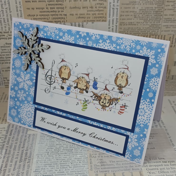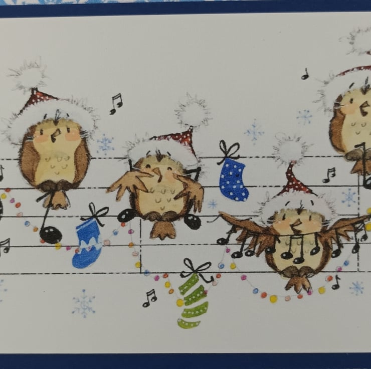 Pack of 2 Christmas cards featuring a cute image of owls singing Christmas carols. The image is overlaid onto a blue and white snowflake background and embellished with a wooden, glittered snowflake.